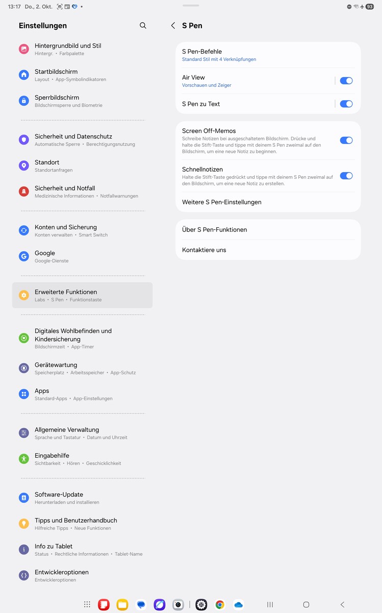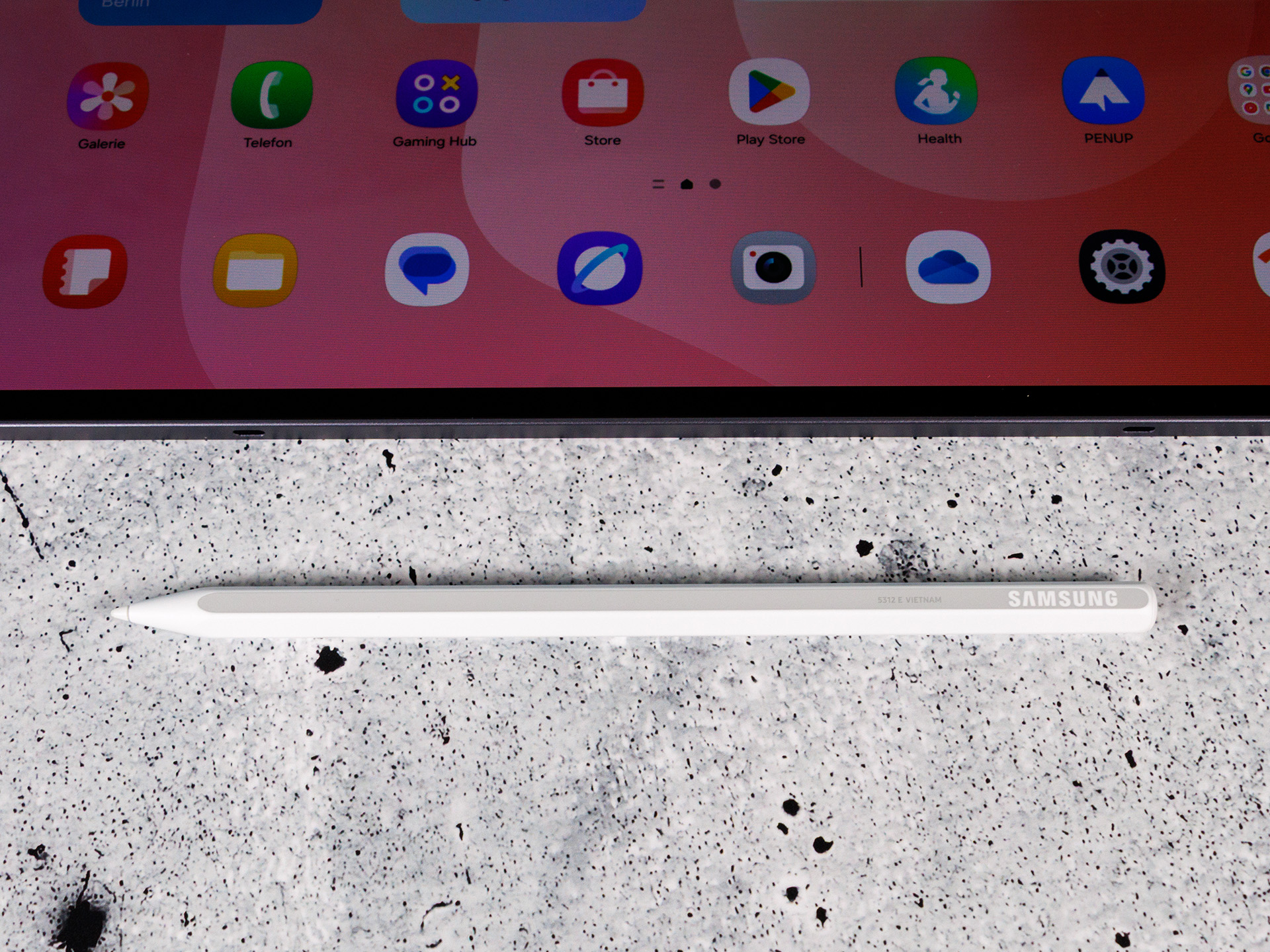 Le stylet S Pen est également de retour, mais sa surface d'attache magnétique est désormais située sur le bord supérieur et non plus à l'arrière de la tablette. Comme cette surface est très étroite et offre donc peu d'adhérence, le stylet a tendance à tomber des poches et des sacs à dos. Les contacts métalliques au dos servent de connexion pour les housses de clavier optionnelles.