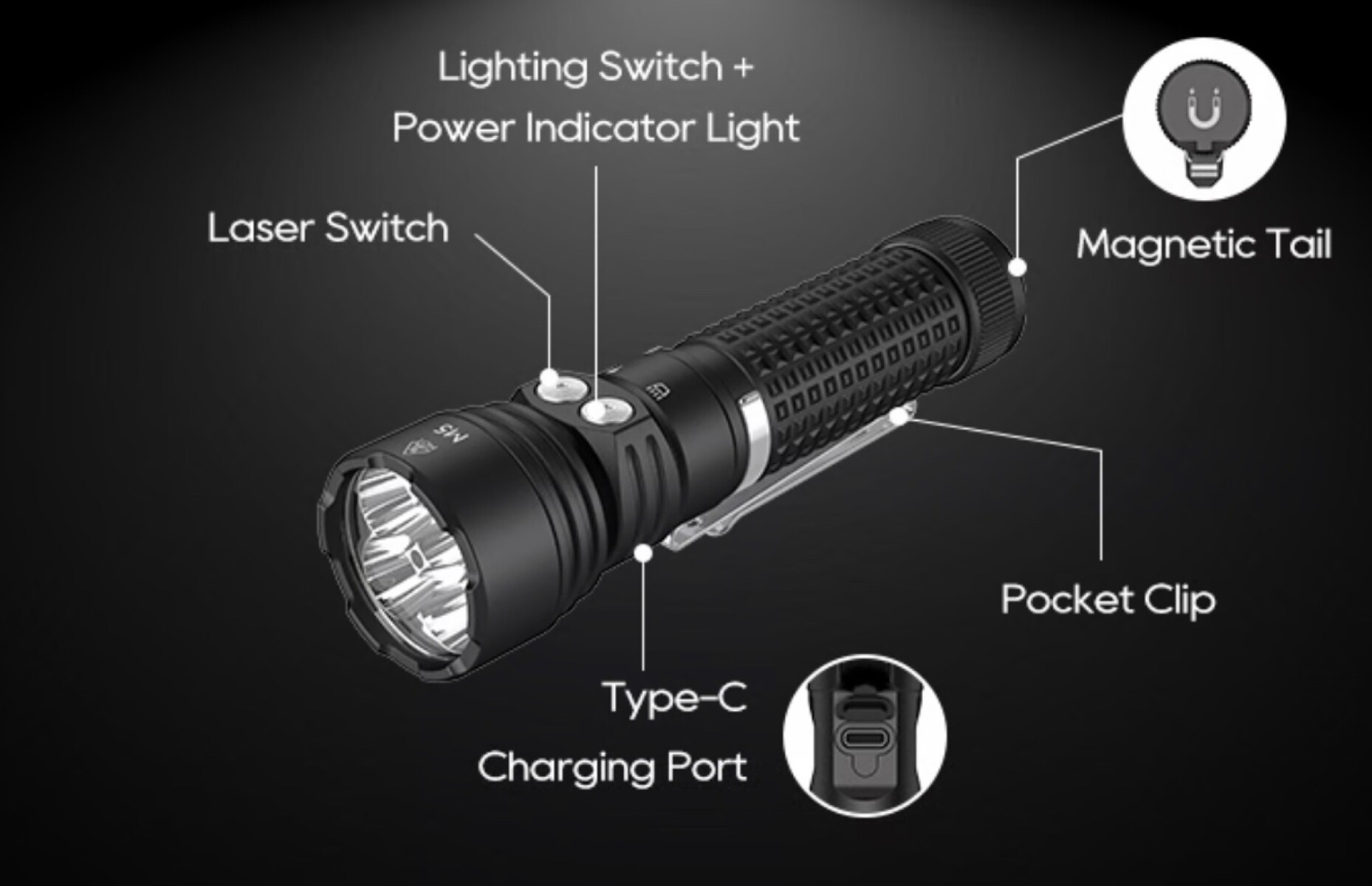 À première vue, la TerraBeast M5 semble être une lampe de poche plutôt banale avec un boîtier en aluminium noir et une certification IP66, ce qui signifie qu'elle peut tomber dans l'eau sans subir de dommages. Cependant, une caractéristique plus ou moins inhabituelle est le laser intégré.
