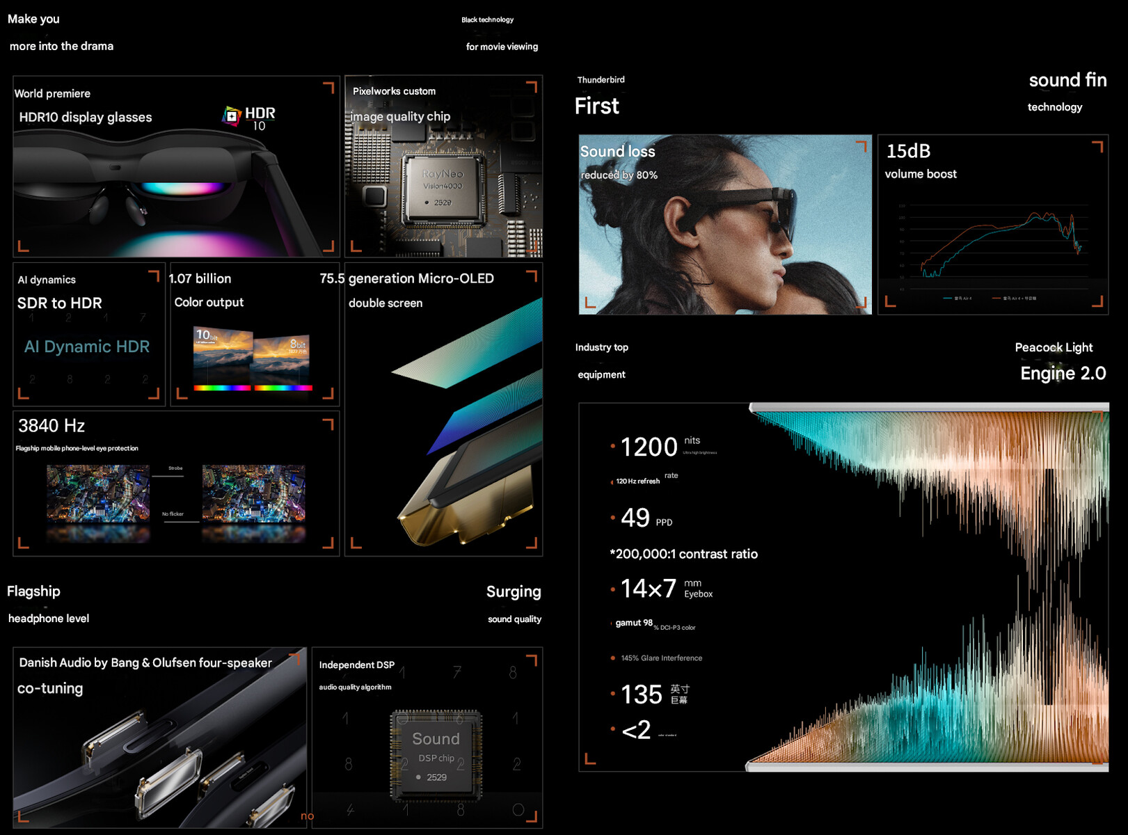 Une puce DSP dédiée est également présente dédiée, qui, associée au réglage Bang & Olufsen, est censée permettre aux lunettes AR d'offrir un son de niveau "casque phare". Autre amélioration notable par rapport à l'Air 3S Pro, les nouvelles lunettes intelligentes sont dotées d'un écran HDR10.