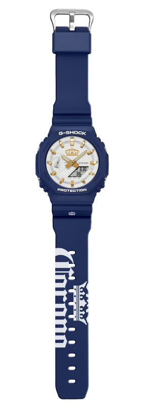 La G-Shock GA-2100CR25-2A présente un cadran blanc avec des accents dorés comme les index et les deux aiguilles analogiques. De plus, l'icône de la couronne Corona est imprimée en or sur le cadran et en blanc sur le bracelet. La montre est dotée d'une lunette, d'un boîtier et d'un bracelet en résine bleue, ce dernier arborant également le logo de la marque en blanc.