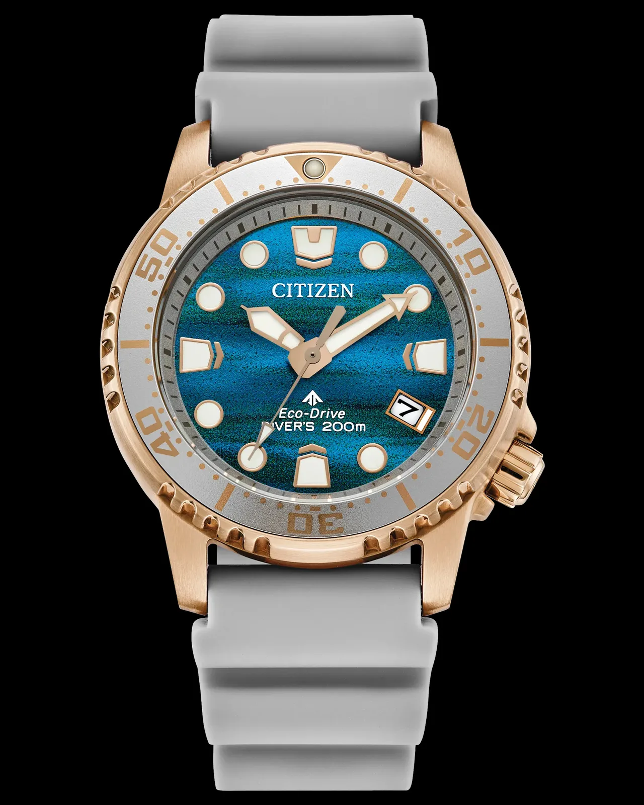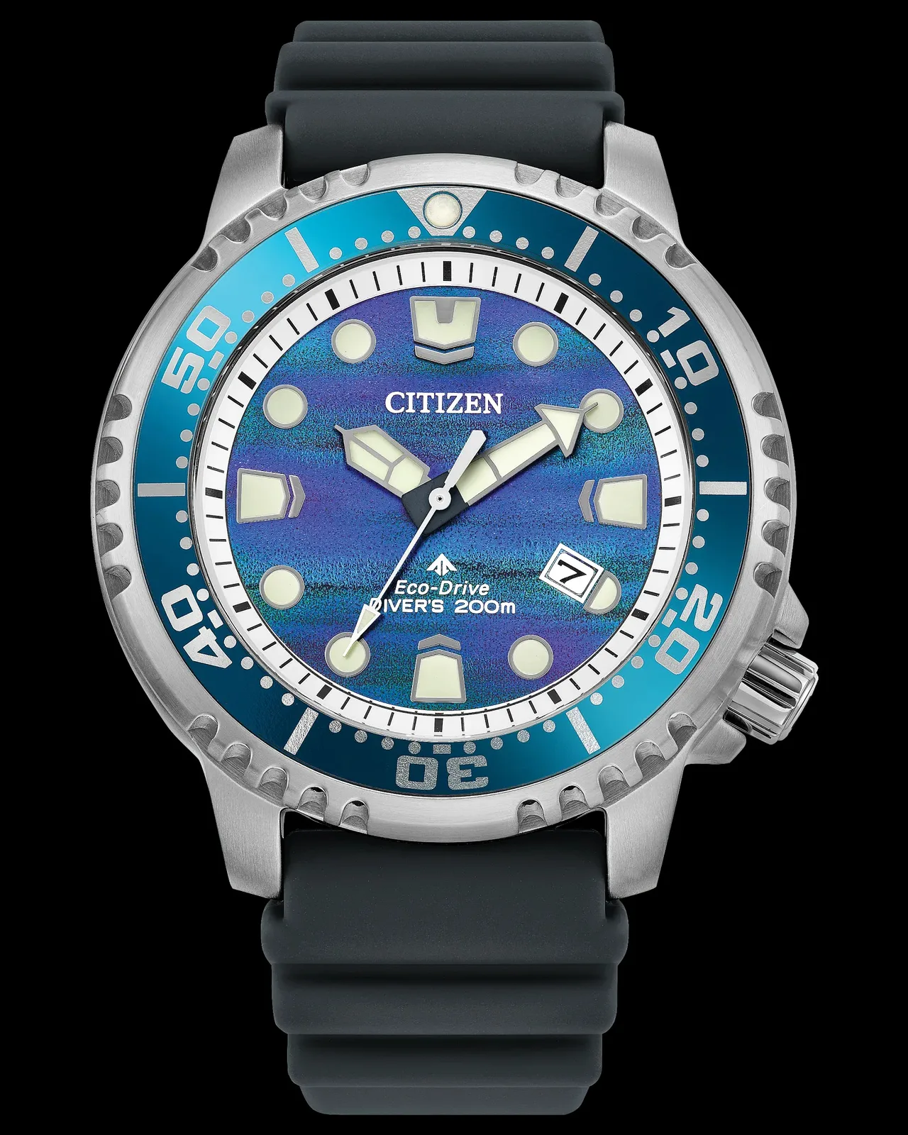 Citizen décrit le nouveau cadran vif comme une finition "encre structurelle" avec des rayures horizontales, qui crée une surface bleue changeante qui devient légèrement violette sous certains éclairages. L'effet est visible sur les deux modèles, tandis que le reste de l'agencement reste cohérent avec les designs existants de la Promaster diver.