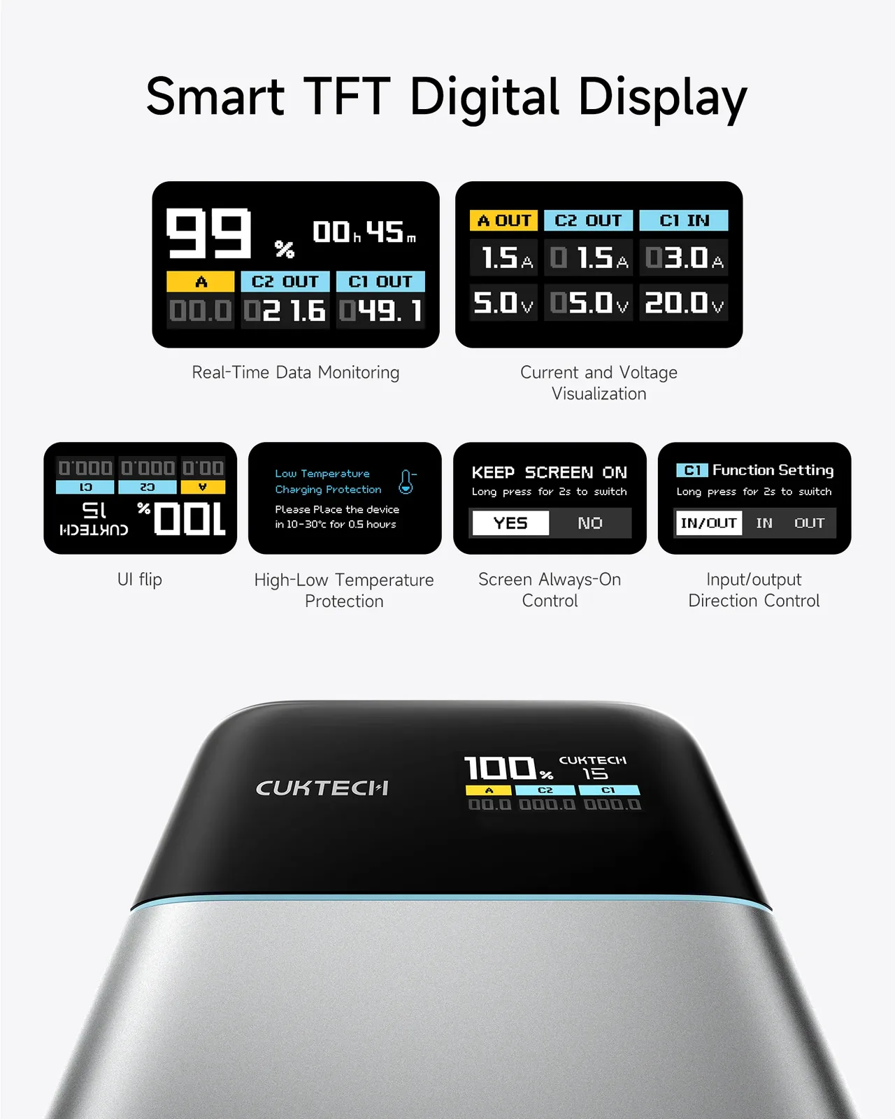 Les utilisateurs peuvent surveiller la charge en temps réel à l'aide de l'écran intégré, qui peut suivre les minutes d'utilisation, le niveau de charge du banc d'alimentation et les niveaux de courant et de tension par port.