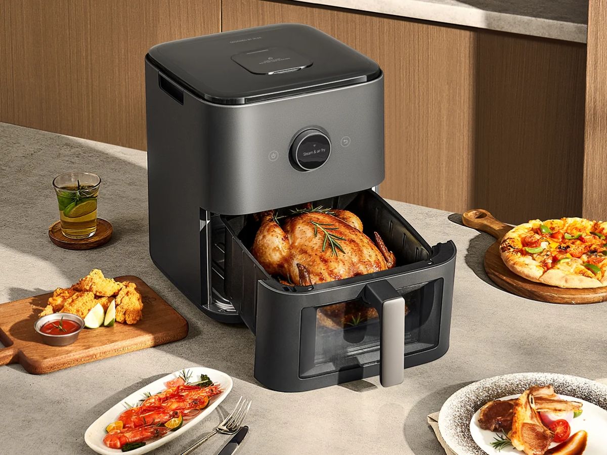La friteuse à vapeur Mijia Smart Steam Air Fryer 7L de Xiaomi couvre une plage de températures allant de 40 à 230 °C (~104 à 446 °F). Pour la cuisson à la vapeur, l'appareil est doté d'un réservoir d'eau de 1,5 litre et peut générer des températures de vapeur élevées allant jusqu'à 130 °C (~266 °F). La fonction vapeur peut également être utile pour réchauffer du pain, des pâtisseries ou des pizzas. De plus, il existe un mode hybride de cuisson à la poêle et à la vapeur, combinant une circulation d'air chaud à 360° et de la vapeur pour une viande tendre et croustillante à l'extérieur. Grâce à la prise en charge d'HyperOS Connect, vous pouvez gérer la friteuse à distance via l'application Xiaomi Home ; elle est également compatible avec Google Home. Grâce à l'application de la marque, vous pouvez également accéder à une série de recettes conçues pour la friteuse.