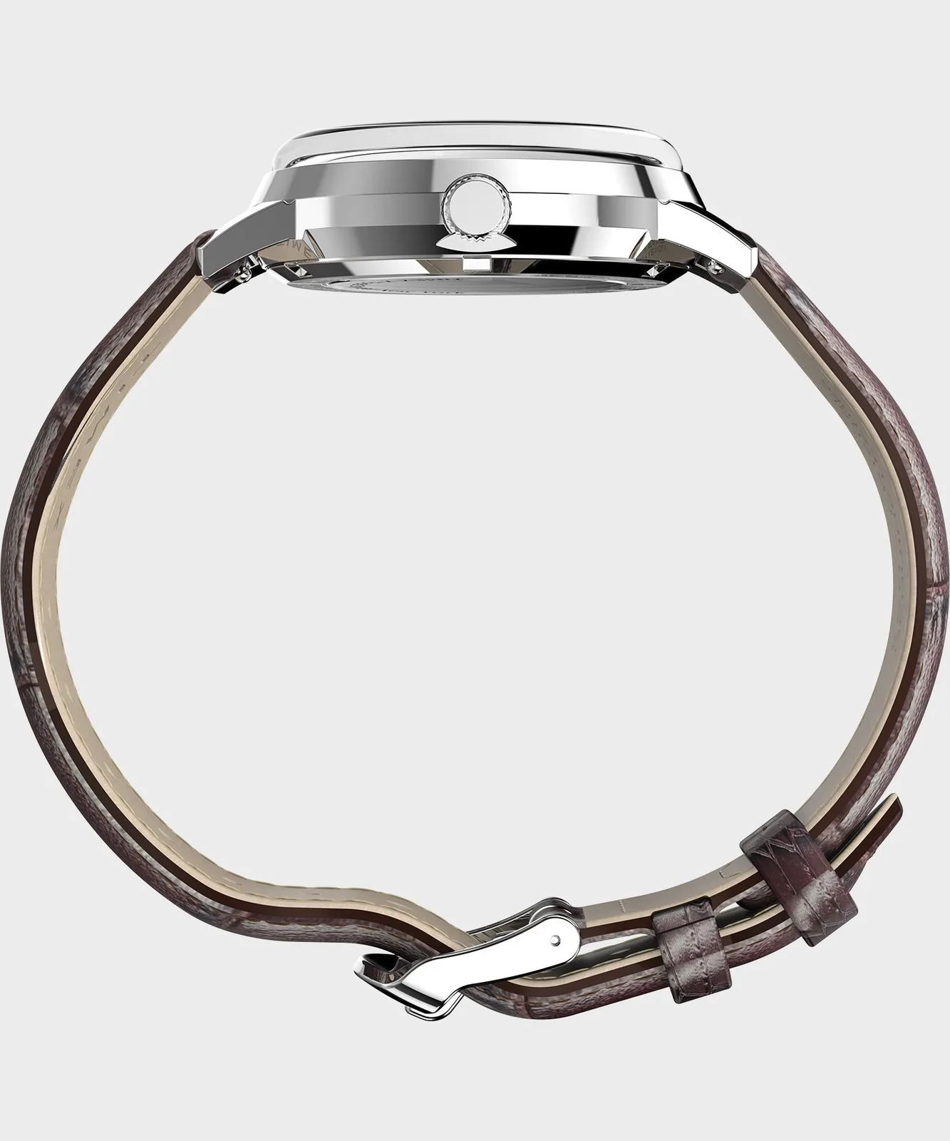 La montre est équipée d'un bracelet en cuir marron avec un motif crocodile gaufré et une fermeture à boucle traditionnelle. Elle offre une résistance à l'eau de 50 mètres, suffisante pour un usage quotidien. Le verre semble être en acrylique bombé. La Olive Marlin est une option mécanique plus habillée.