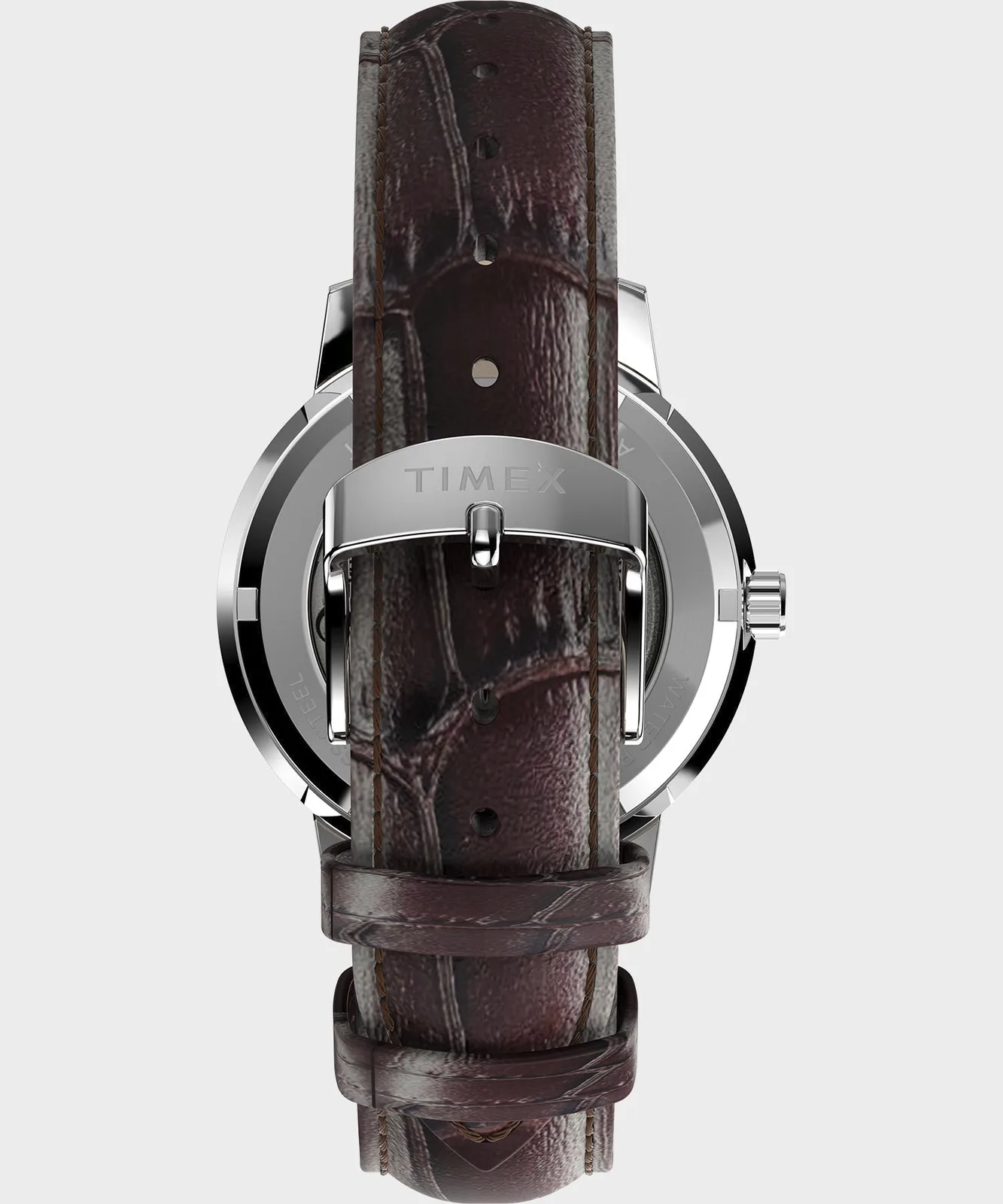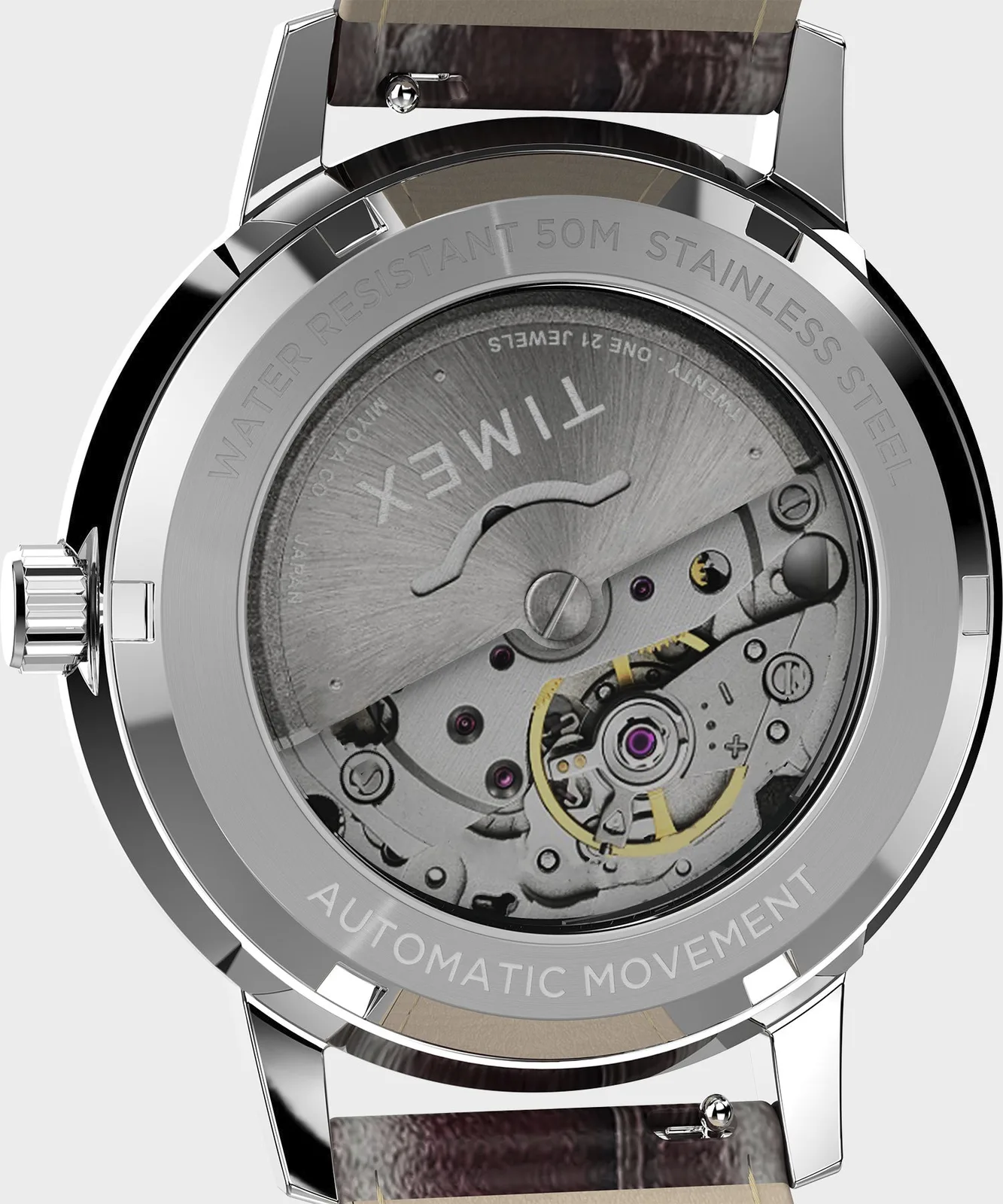 La nouvelle Olive Marlin Automatic est basée sur la ligne Marlin de Timex des années 1960, qui était l'une des premières tentatives de montres mécaniques grand public de l'entreprise pendant le boom mécanique de l'après-guerre. Le modèle conserve le style vintage de l'original, mais est désormais équipé d'un mouvement automatique japonais, visible à travers un fond de boîtier d'exposition. Le rotor est gravé du mot-symbole Timex et le mouvement est indiqué comme étant à 21 rubis. La page produit ne révèle pas le mouvement exact, mais Gear Patrol indique qu'il s'agit d'un mouvement automatique Miyota.