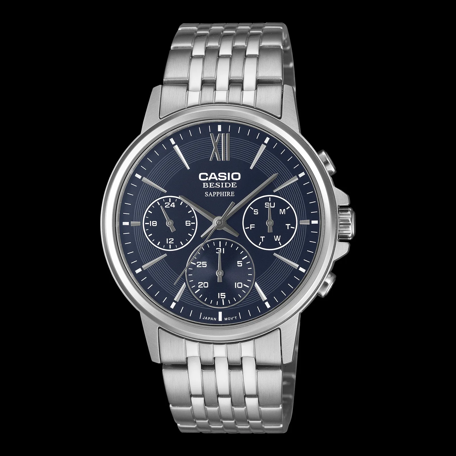 En termes de construction, tous ces modèles Beside partagent un boîtier et une lunette en acier inoxydable avec un verre saphir, ce qui est encore relativement rare à ce niveau de prix dans la gamme de Casio. Les dimensions du boîtier sont de 46 × 40,7 × 10,1 mm, les versions avec bracelet pesant 119 g et les versions avec bracelet en cuir étant nettement plus légères (55 g). L'étanchéité est évaluée à 50 mètres, ce qui signifie que ces modèles conviennent à un usage quotidien, mais ne sont clairement pas destinés à une utilisation sportive.