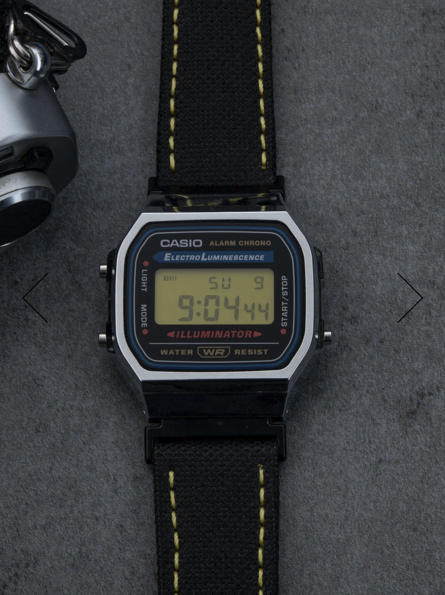La montre de base n'a pas changé. Elle utilise toujours le module numérique standard A168 avec alarme, chronomètre et rétroéclairage. Rien n'indique qu'il y ait eu des améliorations fonctionnelles. L'accent est donc clairement mis sur le style et le design plutôt que sur des fonctions supplémentaires. L'écran a une teinte jaune, ce qui est une référence claire à la couleur de Nikon. Le bracelet est en toile noire avec des coutures jaunes, comme les bracelets d'appareils photo. La forme du boîtier reste proche de l'original. La marque "Illuminator" est toujours visible, ce qui montre clairement qu'il ne s'agit pas d'une refonte complète.