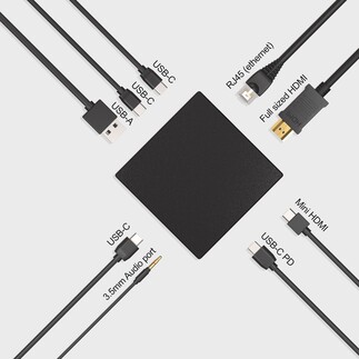 L'avant est équipé d'une prise casque de 3,5 mm, tandis que le côté droit comporte un port USB-C avec prise en charge Power Delivery. Pour les accessoires, le Convergence Hub fournit deux ports USB-C supplémentaires ainsi qu'un port USB-A, tandis qu'Ethernet peut être utilisé pour les connexions réseau filaires. Les ports HDMI et mini-HDMI peuvent être utilisés pour brancher des moniteurs externes. Le chipset Synaptics DL-6950 https://www.synaptics.com/products/displaylink-graphics/integrated-chipsets/dl-6000 DisplayLink prend théoriquement en charge les moniteurs 4K à une fréquence maximale de 60 Hz.