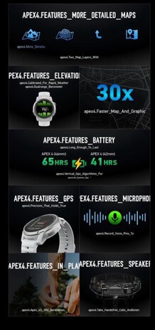 Selon l'une de ces images marketing, le Coros Apex 4 est 30 fois plus performant lors de l'utilisation de cartes et du rendu de graphiques, tandis que les cartes elles-mêmes devraient contenir plus de données qu'auparavant. Coros utiliserait un "baromètre à double gamme" amélioré pour déterminer plus précisément l'altitude et, en combinaison avec le module GPS, pour localiser la position de l'utilisateur avec encore plus de précision.