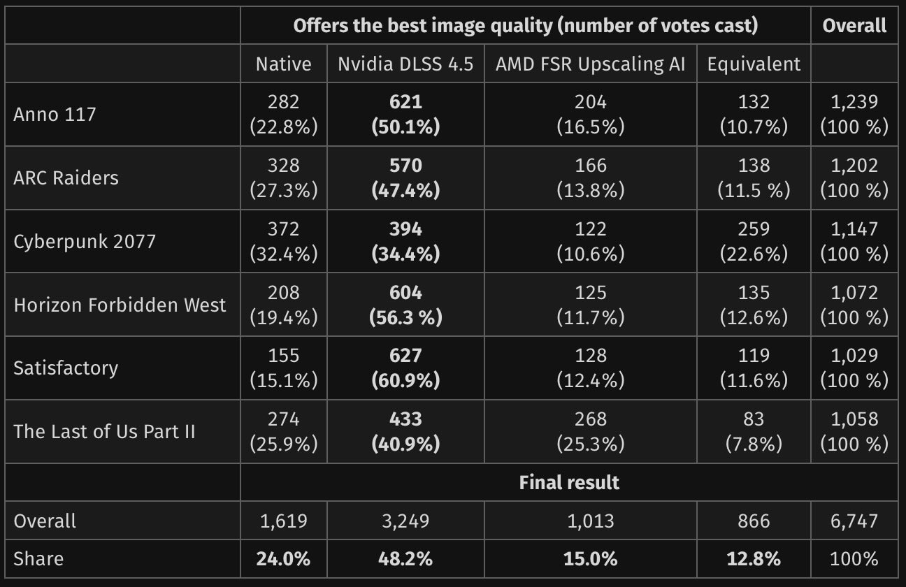 Un grand nombre de jeux ont été inclus dans le test, notamment Anno 117, ARC Raider, Cyberpunk 2077 et Last of Us Part II. Au final, 1 619 participants, soit 24 %, ont préféré la qualité native, 1 013, soit 15 %, la FSR 4 d'AMD, tandis que la grande majorité a préféré la DLSS 4.5 de Nvidia, soit 3 249 participants, soit 48,2 %.