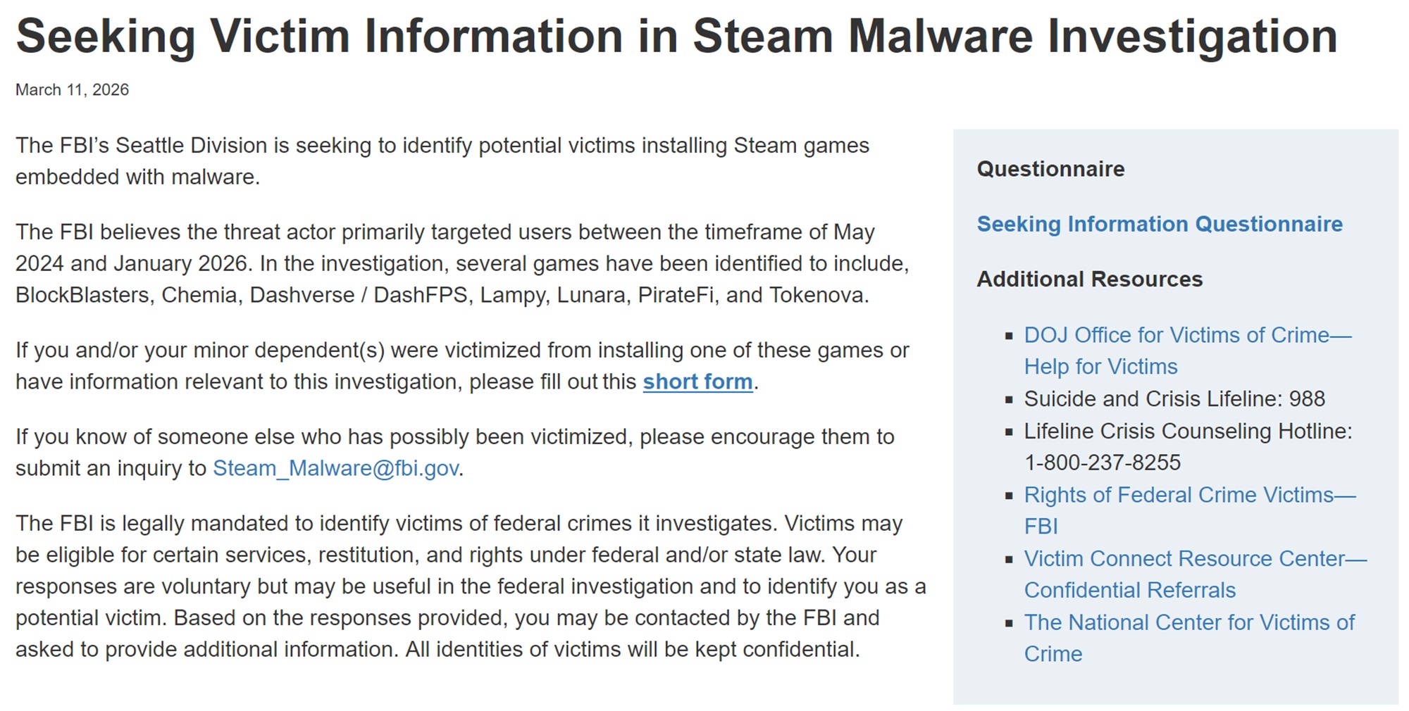 Après une série de jeux Steam infectés par des jeux Steam infectés par des logiciels malveillants ont fait surface ces dernières années, le FBI en a pris note. Sur son site web https://www.fbi.gov/how-we-can-help-you/victim-services/seeking-victim-information/seeking-victim-information-in-steam-malware-investigationil énumère une série de titres affectés et demande aux victimes de soumettre un formulaire contenant davantage d'informations. Valve a également vérifié que le message est légitime et propose aux joueurs de participer à l'enquête.