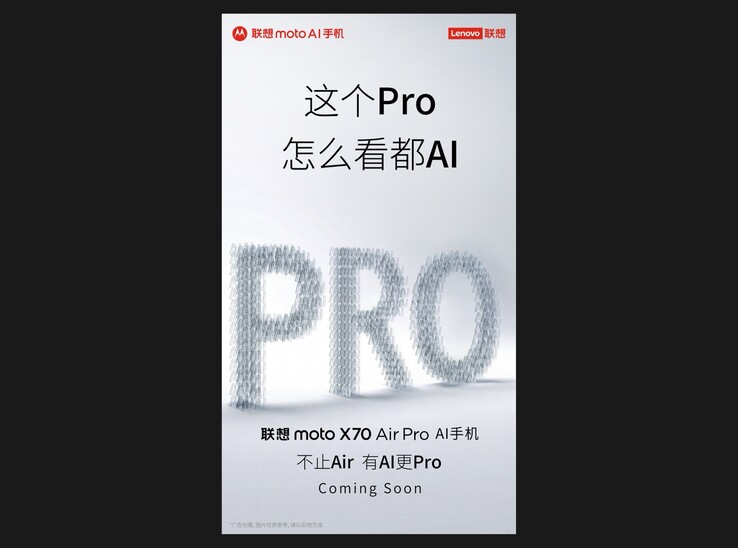 Motorola a maintenant publié une image teaser sur le réseau social chinois Weibo qui indique que le Moto X70 Air Pro sera bientôt officiellement dévoilé. Nous ne savons pas si ce smartphone aura le même design que le Moto X70 Air Pro Motorola Signaturequi devrait également être présenté en janvier. Le teaser promet seulement que le smartphone est "plus Pro" et qu'il offre plus de fonctions d'intelligence artificielle. Cela suggère que l'appareil sera équipé d'un processeur plus puissant que le Snapdragon 7 Gen 4 de Qualcomm Qualcomm Snapdragon 7 Gen 4 que l'on trouve dans le Motorola Edge 70.