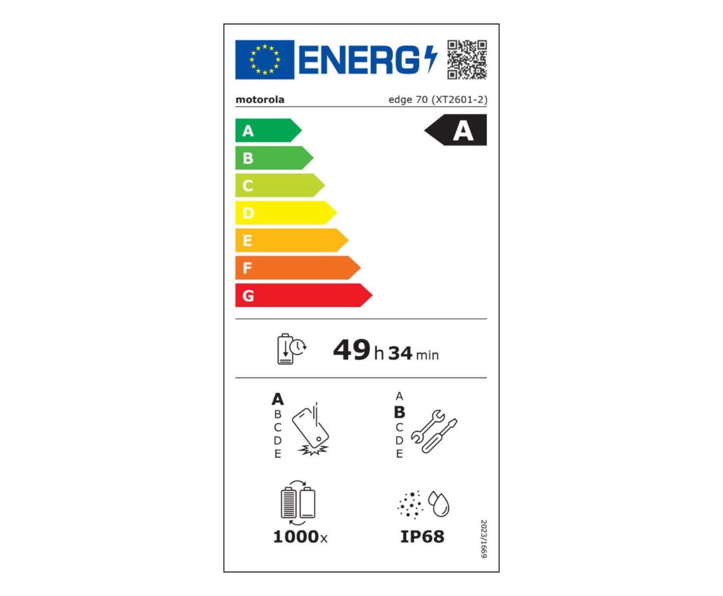 La certification IP68 est également mentionnée, de même que l'excellente protection contre les chutes et l'efficacité énergétique, mais seulement une note "B" pour la réparabilité. Apparemment, le Edge 70 offrirait également près de 50 heures d'autonomie entre deux charges. En d'autres termes, l'UE estime que le Edge 70 pourrait durer jusqu'à 25 % de plus sur une seule charge que le Galaxy S25 Edge ou l'iPhone Air.