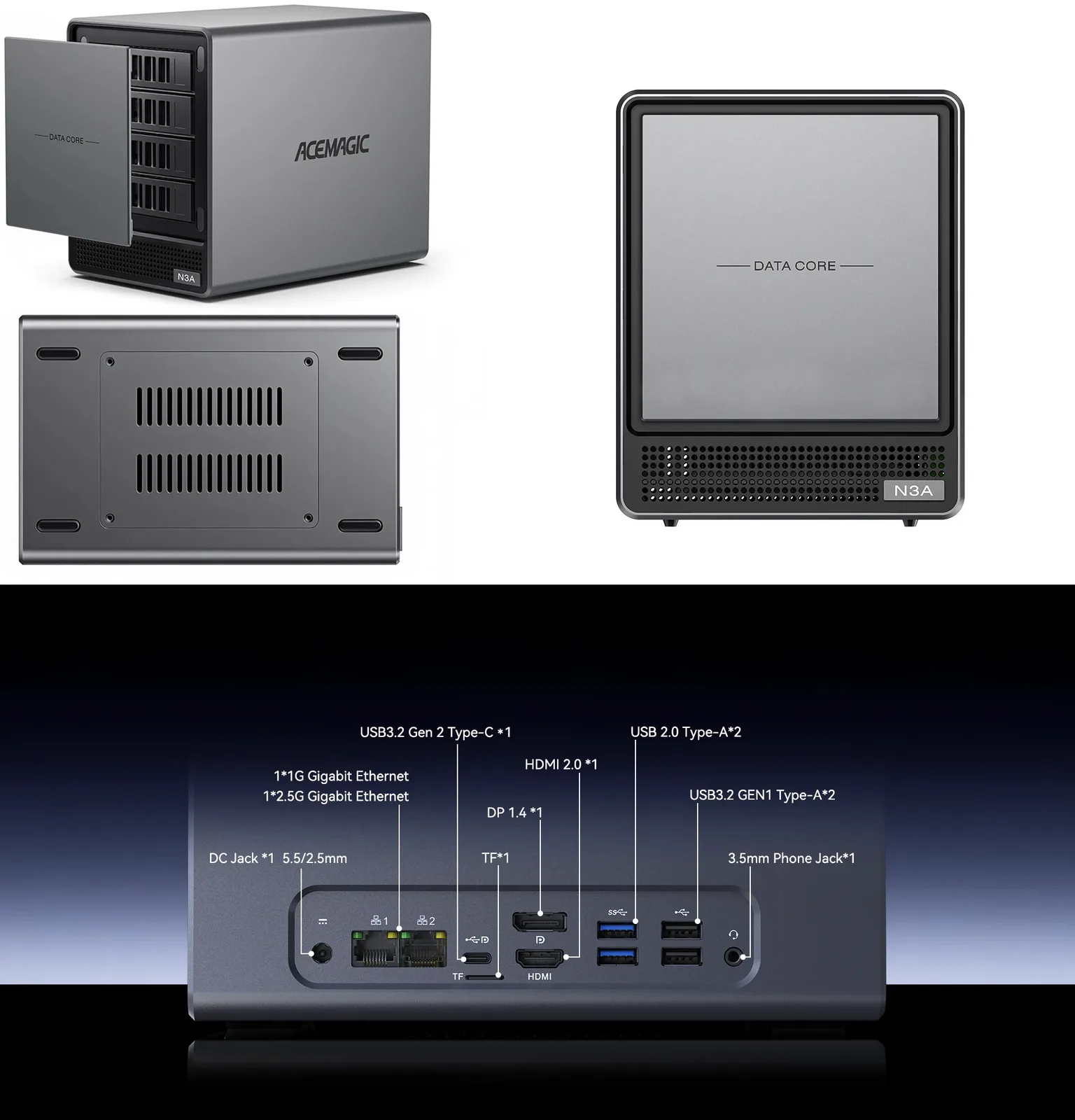 Du point de vue du design, le mini PC est doté d'un corps entièrement métallique et d'un couvercle frontal magnétique. Les baies pour lecteurs SATA sont dotées d'un mécanisme de glissement facileles baies de disques SATA sont dotées d'un mécanisme de glissement facile, permettant un remplacement et une installation rapides des disques durs. Acemagic précise que le double refroidissement du NAS garantit des performances optimales 24 heures sur 24 et 7 jours sur 7.