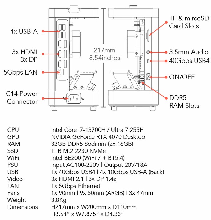 La campagne Kickstarter a déjà atteint ses objectifs de financement et l'équipe chinoise propose désormais deux modèles grâce à l'atteinte des stretch goals. Wee Beastie Core est le modèle à 699 $ qui intègre un GPU RTX 4070 MXM et un ancien processeur Intel Core i7-13700H Intel Core i7-13700H tandis que le Wee Beastie PRO est équipé d'un processeur plus récent, l'Intel Core Ultra 7 255H Intel Core Ultra 7 255H plus récent. Les deux modèles sont équipés d'un bloc d'alimentation de 400 W, d'un éclairage RVB sur les ventilateurs, de 32 Go de RAM et d'un disque dur SSD de 1 To par défaut, et peuvent supporter jusqu'à 16 To de stockage et 128 Go de RAM. L'équipe chinoise teste essentiellement la demande pour l'instant, puisque les modèles Core seront limités à 200 unités et les PRO à 300.