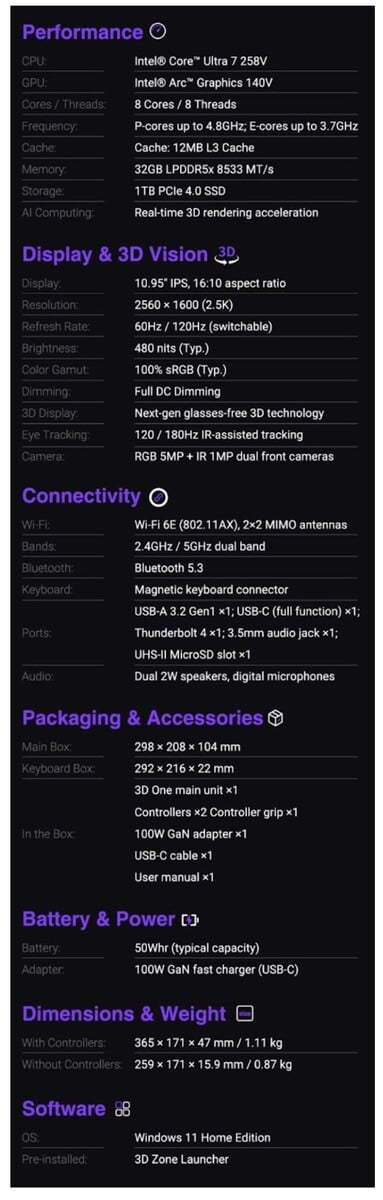 Son poids est de 0,87 kg, ce qui est similaire à celui de la Surface Pro 10, qui est de 0,885 kg. Les contrôleurs de jeu de taille normale avec joysticks à effet Hall ajoutent 0,24 kg lorsqu'ils sont fixés. Comme pour la Surface Pro, un clavier et un support peuvent être achetés en option, ce qui permet d'utiliser le 3D One comme un ordinateur portable 2-en-1.