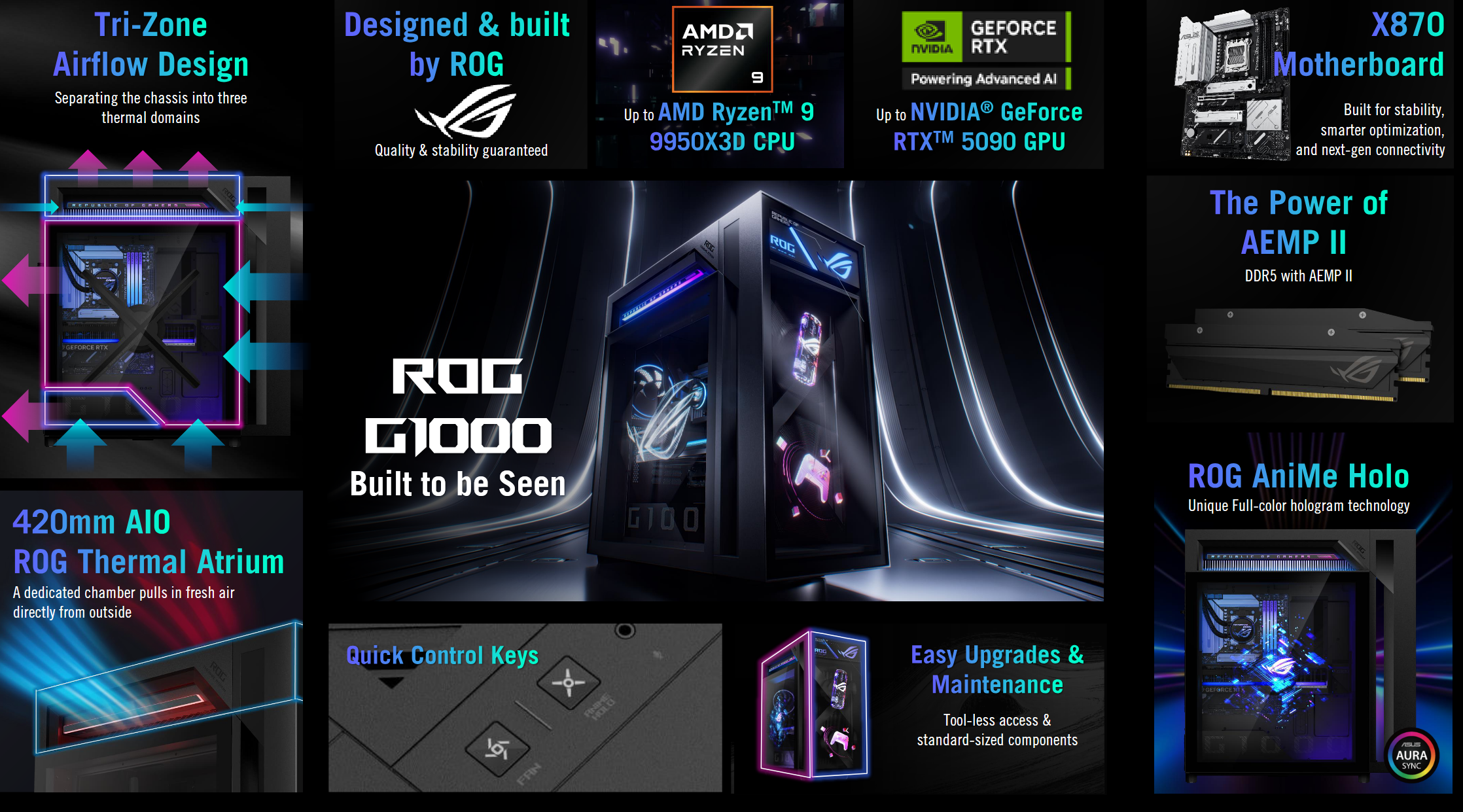 Le ROG G1000 prend en charge jusqu'à AMD Ryzen 9 9950X3D associés à des processeurs NVIDIA GeForce RTX 5090 de NVIDIA. Asus construit le système sur une carte mère X870 conçue en interne par ROG. La prise en charge de la mémoire comprend la DDR5 avec AEMP II, le réglage automatique du profil de mémoire d'Asus conçu pour améliorer la stabilité et les performances sans configuration manuelle.