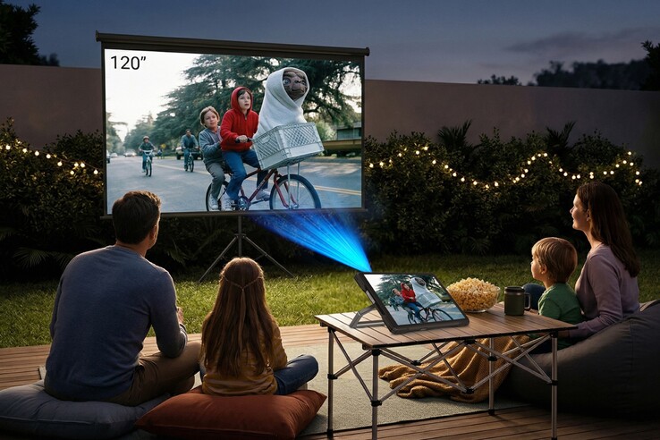 Elle offre également 16 Go de mémoire vive et 512 Go de mémoire flash. La tablette dispose d'une caméra selfie de 32 mégapixels, d'une caméra principale de 50 mégapixels et d'une caméra de vision nocturne de 64 mégapixels, combinée à quatre LED infrarouges. La tablette offre une série de caractéristiques inhabituelles, notamment un projecteur DLP avec autofocus, une résolution de 1 920 x 1 080 pixels et une luminosité de 260 lumens. Une grande lampe de camping se trouve à l'arrière. Un modem 5G avec double emplacement SIM, un emplacement microSD et une connexion casque de 3,5 mm complètent l'ensemble.