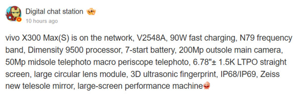 Aujourd'hui, Vivo a certifié le X300 Max en Chine avant sa sortie sur le marché domestique de Vivo. Portant le numéro de modèle V2548A, le X300 Max devrait se situer au-dessus du X300 et du X300e la rumeur X300e mais en dessous du X300 Pro et du X300 Ultra. Digital Chat Station indique qu'il pourrait également y avoir une deuxième variante du X300 Max ; les détails concernant ce modèle restent cependant inconnus pour le moment.