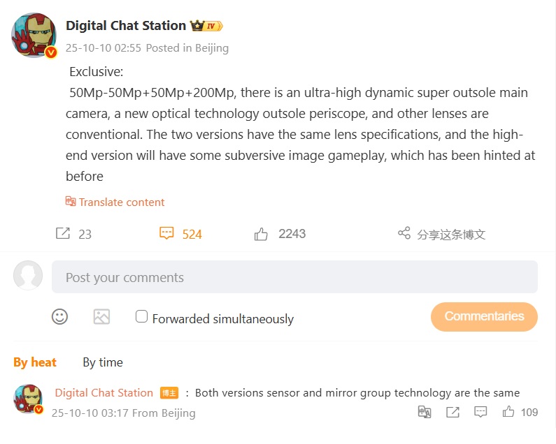 L'éminent leaker chinois suggère également qu'un Xiaomi 17 Ultra doté de quatre capteurs photo, trois de 50 MP et un de 200 MP, se profile à l'horizon. Il fait également allusion à une nouvelle technologie optique dans le module périscope, qui sera combinée à un nouveau capteur principal extrêmement dynamique, tandis que les deux autres capteurs seraient conventionnels. Enfin, il affirme qu'il existe deux variantes du Xiaomi 17 Ultra avec des capteurs et des objectifs identiques, mais que seul le modèle haut de gamme devrait offrir une technologie d'appareil photo révolutionnaire, peut-être le zoom optique dont il a été question précédemment. Il n'est pas certain que les capteurs de 50 MP avec trait d'union indiquent d'autres surprises ou qu'il s'agisse simplement d'une faute de frappe, mais cette question fait l'objet d'un débat animé dans les commentaires.