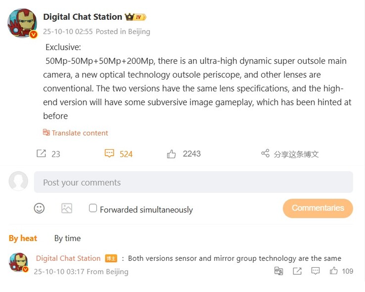 D'autres spéculations circulent sur Weibo, résumées par l'utilisateur X @Devinarde (voir ci-dessous). En plus d'un zoom optique d'environ 3-7x, certains utilisateurs de Weibo spéculent également sur une équipe de capteurs composée d'un ISOCELL HPE de 1/1. 4 pouces de 200 MP et d'un ISOCELL JN5 de 1/1.276 pouces, qui forment apparemment une sorte de double téléobjectif avec une optique qui pourrait fonctionner de la même manière que celle du Huawei Pura 80 Ultra avec son curseur mobile, mais à l'envers.