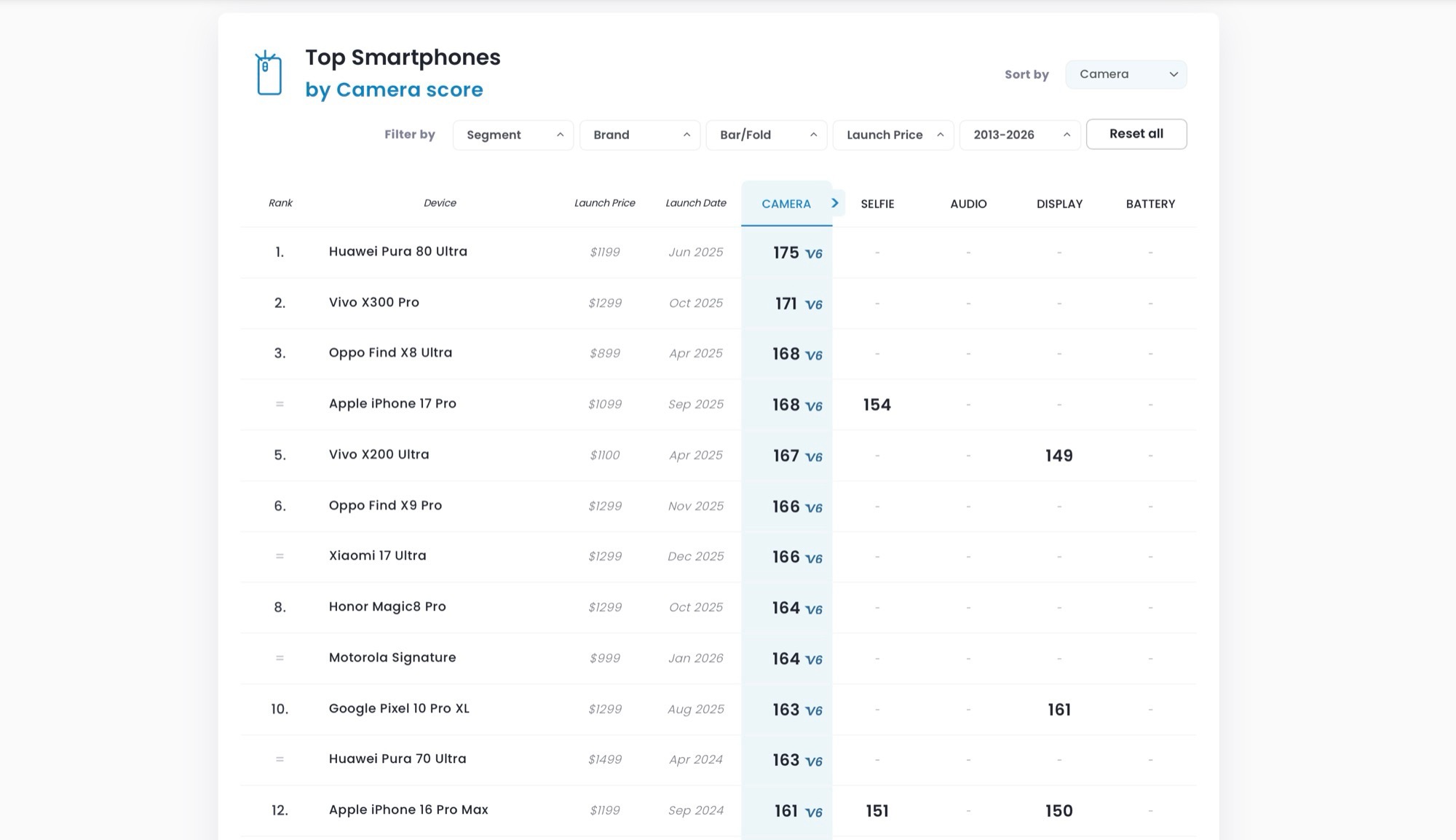 Ce score n'est suffisant que pour obtenir la sixième place dans le classement actuel des smartphones, derrière l Apple iPhone 17 Proqui occupe la quatrième place avec 168 points, et loin derrière le Huawei Pura 70 Ultrade Huawei, qui occupe la première place avec 175 points. Plus précisément, Xiaomi n'obtient même pas le meilleur score dans aucune catégorie. Le score de l'iPhone 17 Pro est principalement dû aux problèmes vidéo du Xiaomi 17 Ultra.