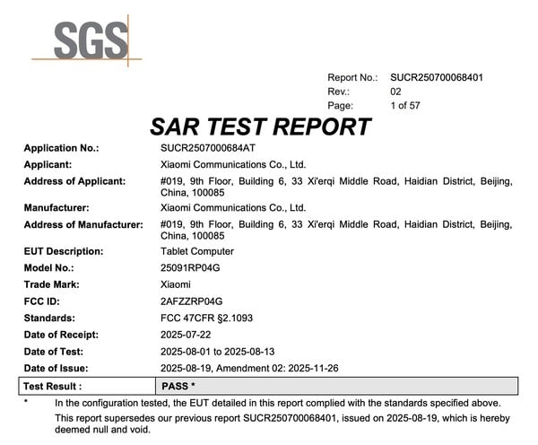 La tablette a été certifiée sous le numéro de modèle "25091RP04G" À titre de comparaison, le modèle chinois de la Xiaomi Pad 8 Pro utilise un numéro de modèle presque identique, "25091RP04C", le "C" désignant le modèle chinois et le "G" la version mondiale.