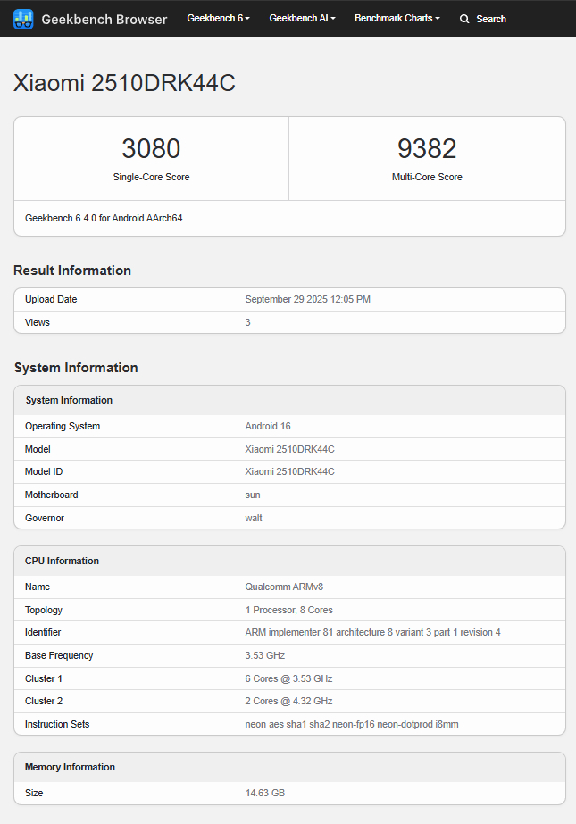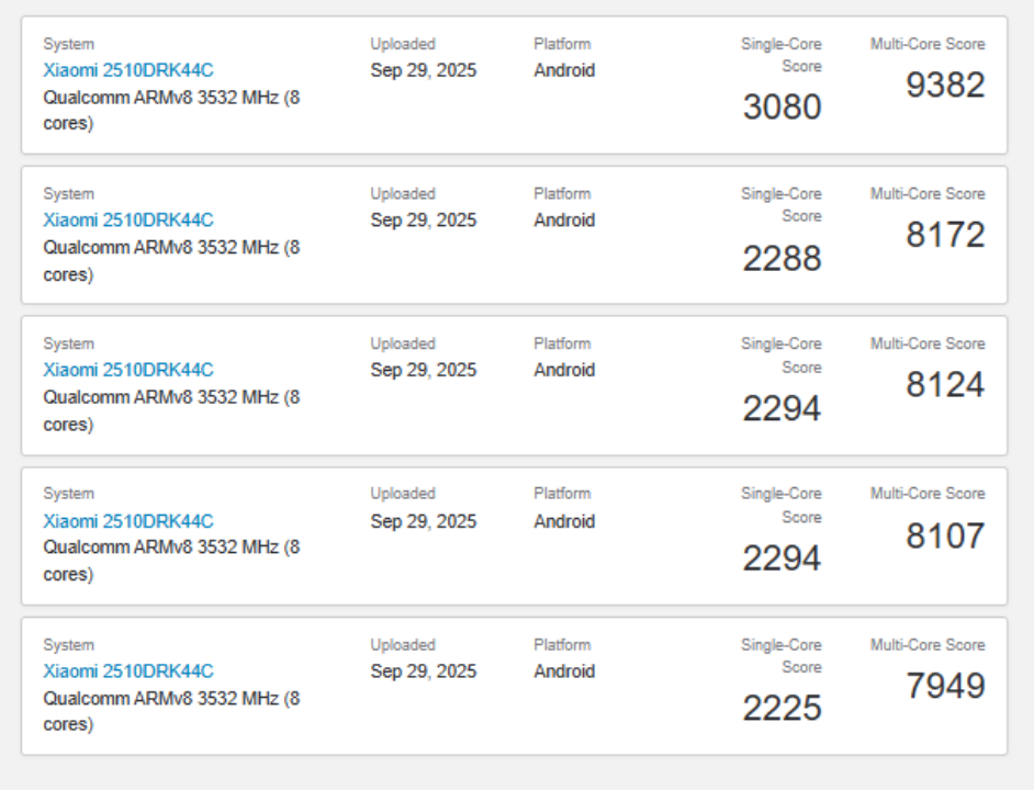 En fait, ils indiquent que Xiaomi a opté pour le même chipset que celui utilisé l'année dernière dans le Redmi K80 Pro. Plus précisément, tous les listings Geekbench associent le Xiaomi 2510DRK44C à la puce Snapdragon 8 Elite et son module Adreno 830 GPU. En bref, les moyennes de 2 436 et 8 346 dans les benchmarks monocœur et multicœur de Geekbench 6 sont inférieures à la médiane du Xiaomi 2510DRK44C Snapdragon 8 Elite que nous avons testés jusqu'à présent.