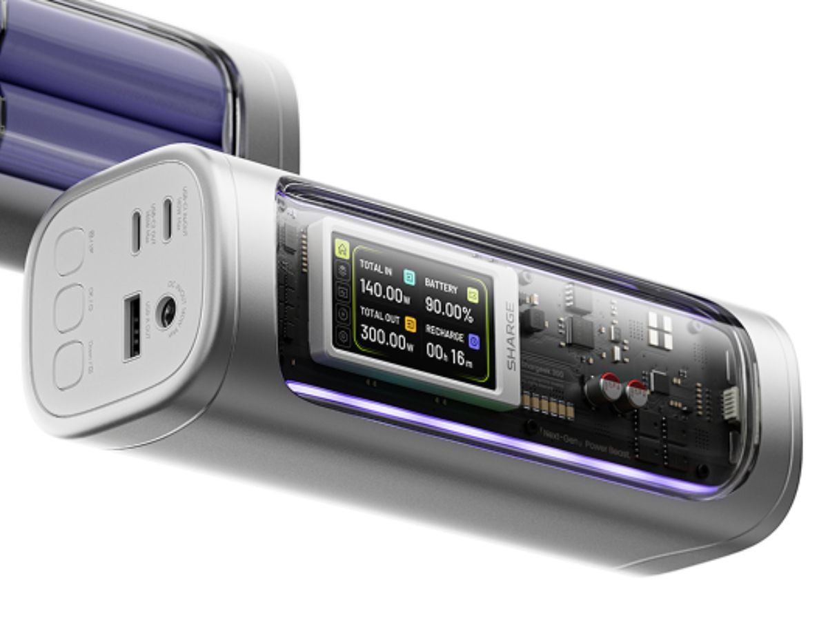 Le Shargeek 300 est doté d'une batterie de 24 000 mAh, qui se recharge via une entrée de 140 W maximum. L'un des côtés de la banque d'énergie est transparent, révélant un écran numérique. Les utilisateurs peuvent y consulter des informations telles que la puissance absorbée en temps réel, la température et l'état de la batterie. Parmi les autres caractéristiques, citons l'éclairage RVB et le corps en aluminium.