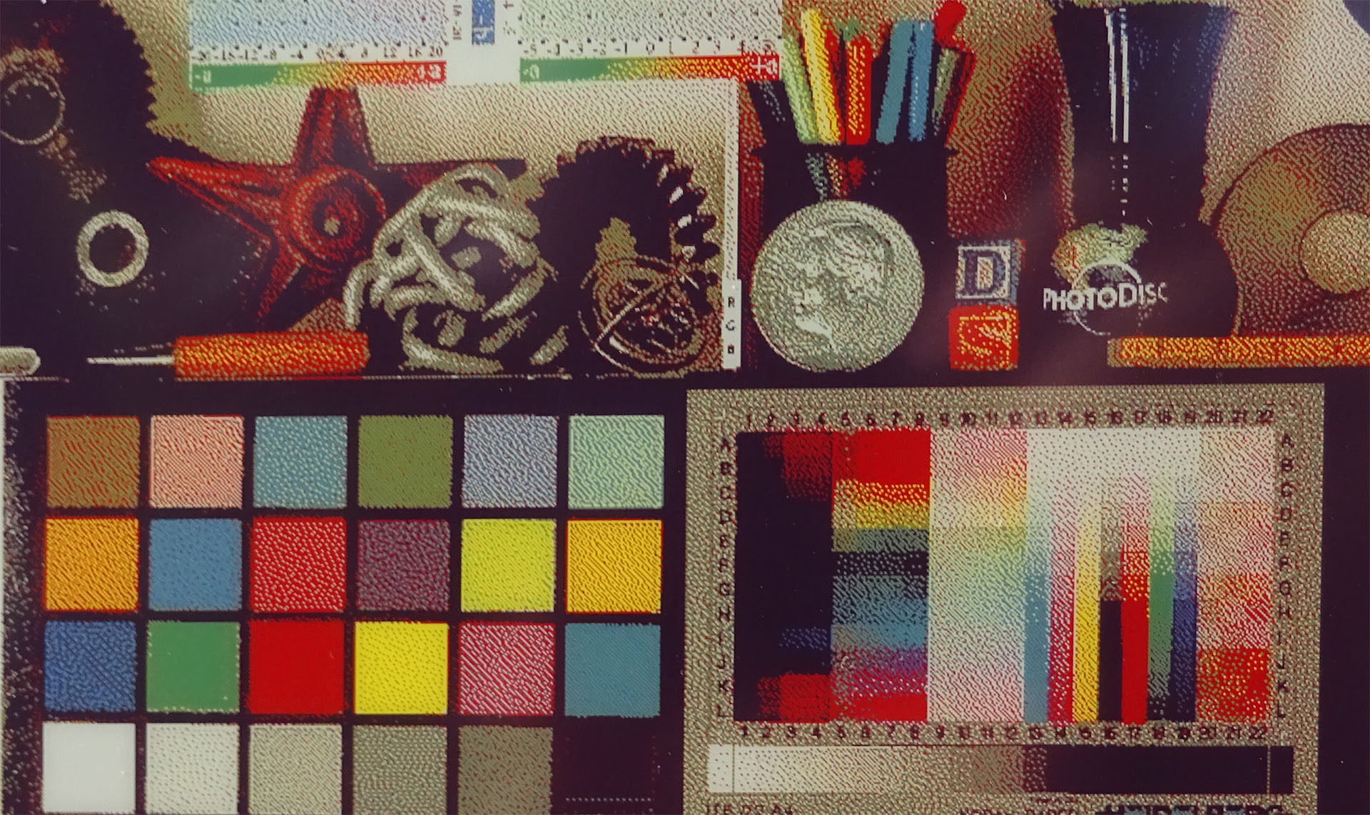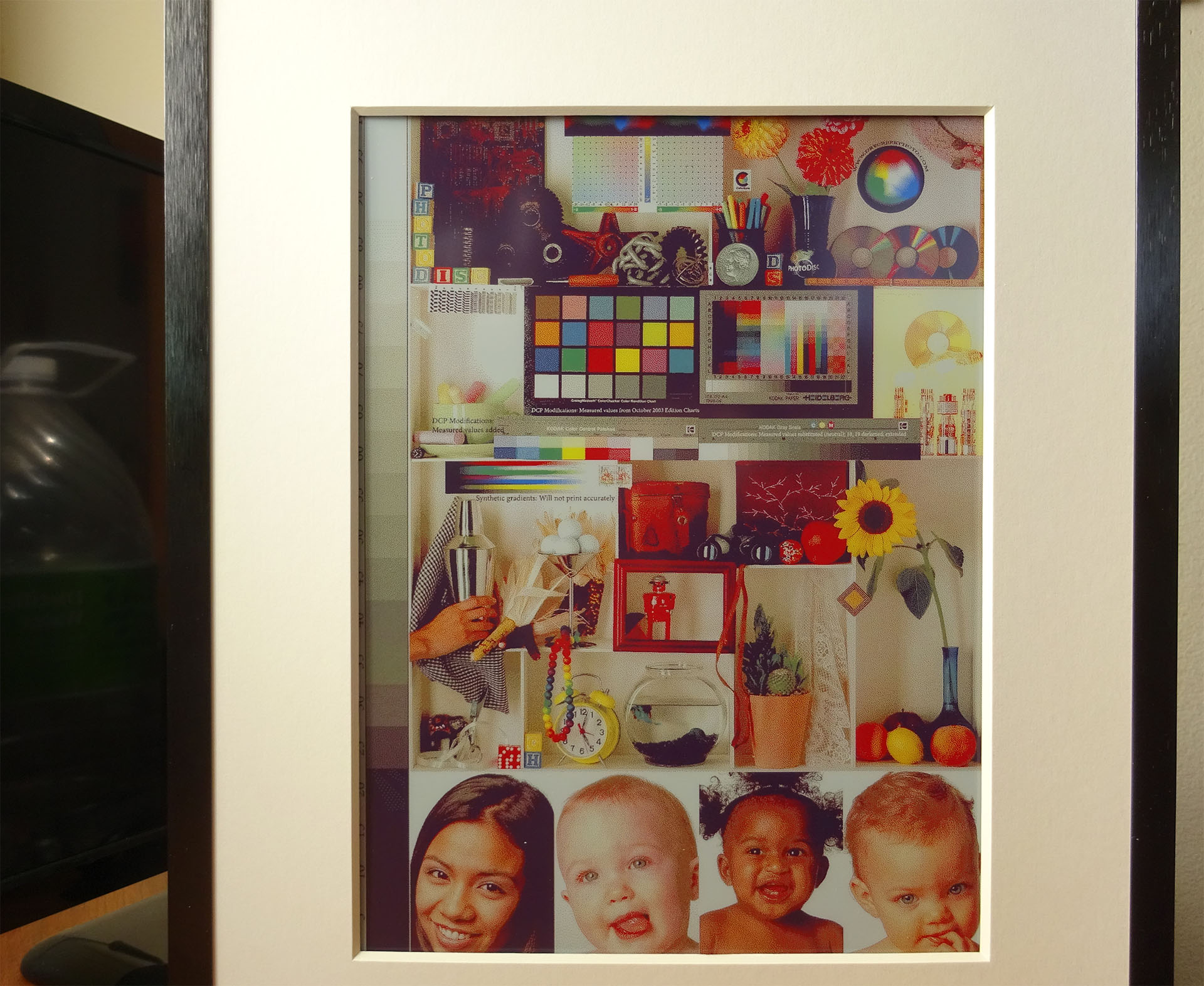 Une comparaison avec un tirage photo de la cible d'essai Photodisc met en évidence les limites du panneau E Ink Spectra 6. L'arrière-plan n'est pas d'un blanc pur, ce qui limite les détails des ombres et le contraste maximal. La gamme de couleurs est également limitée, en particulier dans les verts et les bleus.