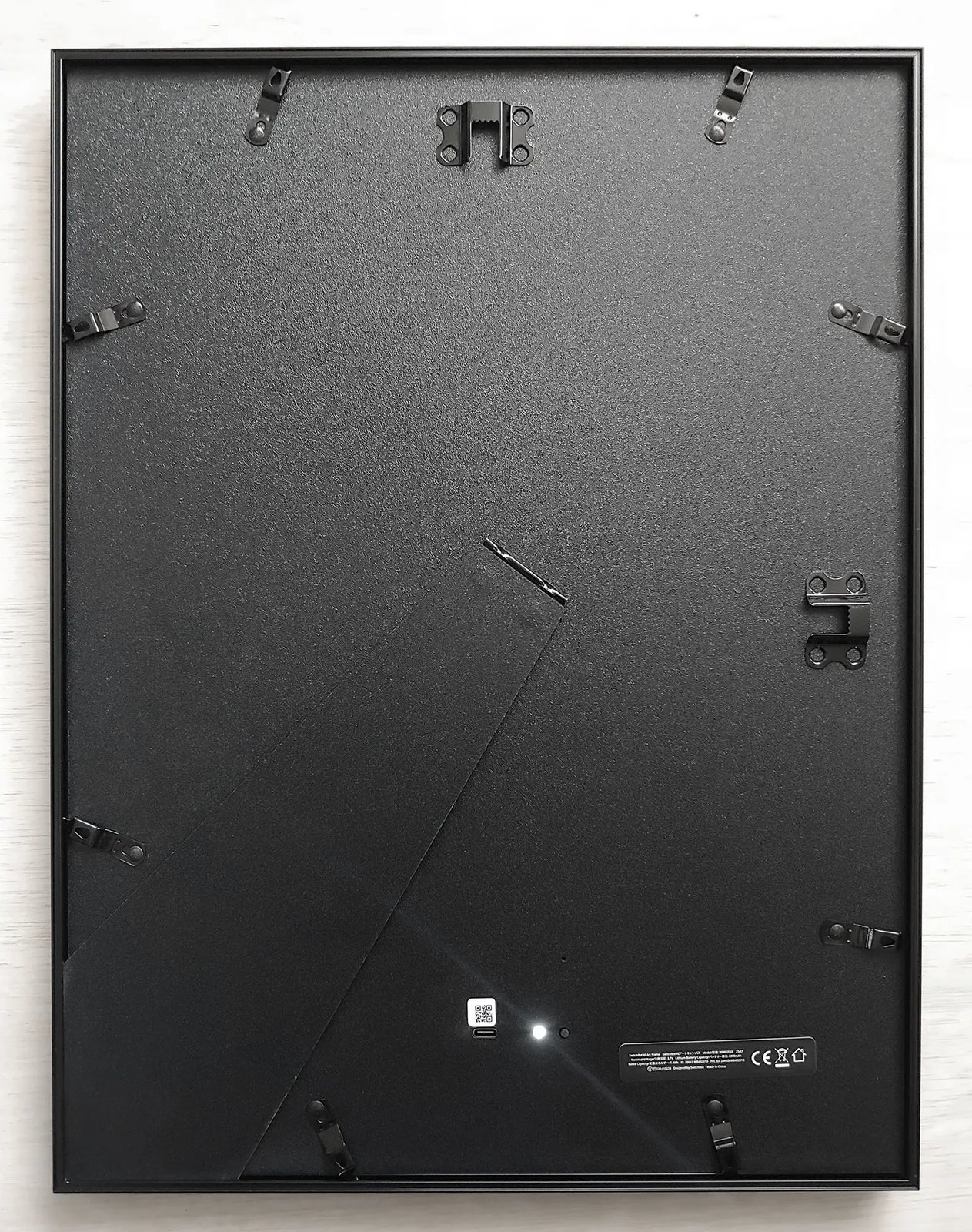 Le SwitchBot 13,3 pouces a un design simple qui ressemble de loin à une œuvre d'art encadrée ordinaire, avec un écran E Ink Spectra 6 dont la surface est mate pour réduire les reflets de la lumière, est monté dans un cadre en aluminium. Le cadre peut être fixé au mur ou placé sur un bureau grâce à un support dépliable. Le port de charge USB-C, le bouton de connexion et le voyant d'état LED se trouvent à l'arrière, ce qui signifie que le cadre doit être retiré du mur pour être chargé ou configuré.