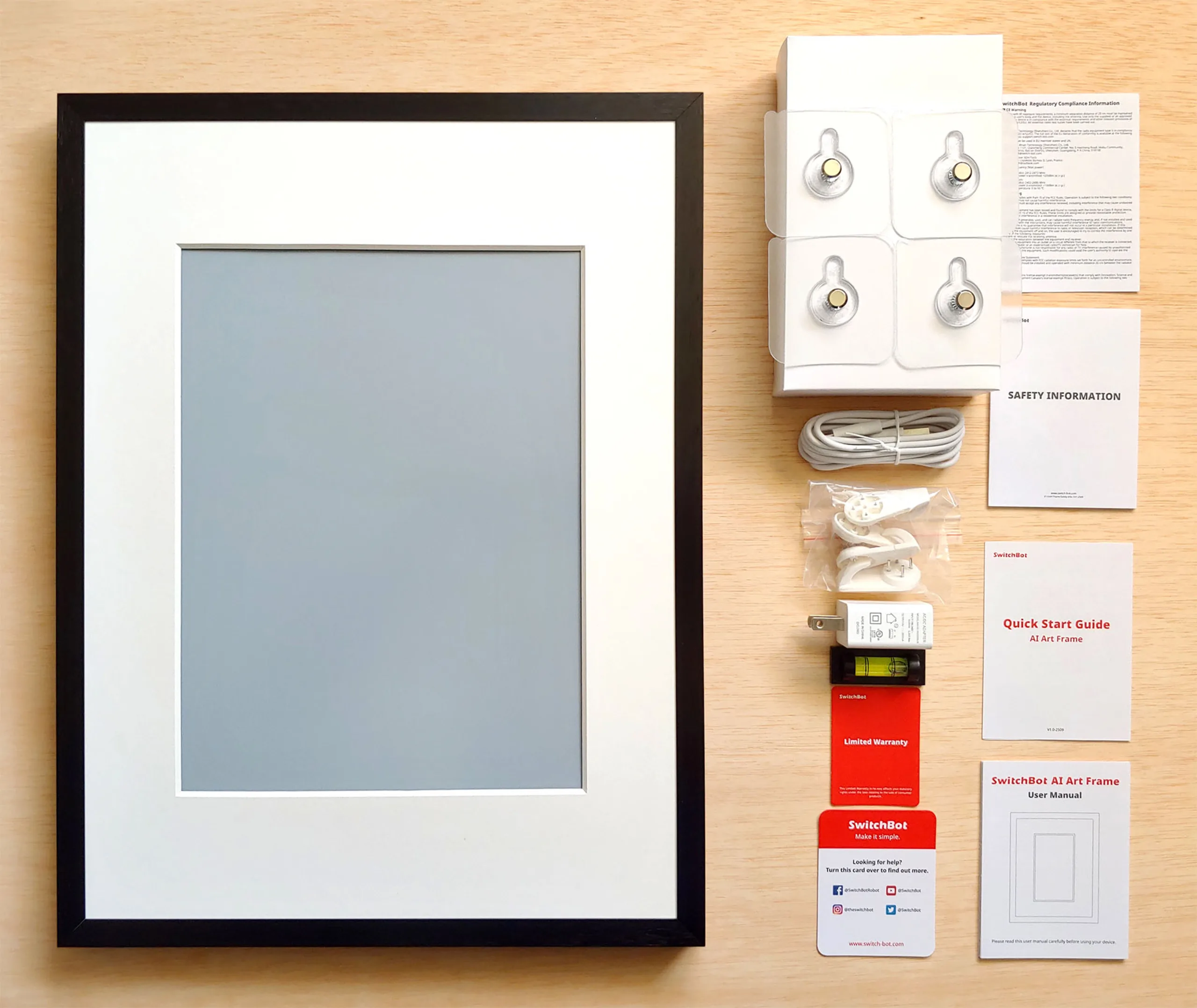 L'emballage comprend un USB-C et un chargeur, deux jeux de clips de montage, un niveau à bulle, trois tapis en papier, un guide de démarrage rapide, un manuel d'utilisation, une carte d'assistance et trois dépliants de sécurité.