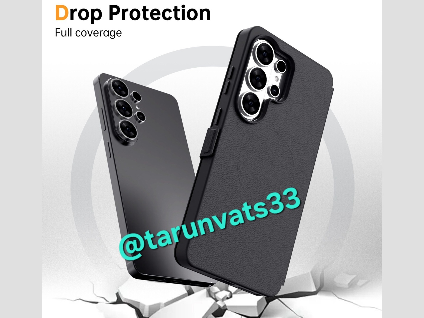 L'image provient de Tarun Vats sur X et montre le Galaxy S26 Ultra avec et sans étui de type livre. Le modèle sans étui est une variante noire qui comporte un îlot pour les trois principaux appareils photo au dos et un quatrième appareil photo à l'extérieur de l'îlot, à droite. Au-dessus de ce quatrième appareil photo se trouvent le flash et un capteur supplémentaire. Les boutons d'alimentation et de volume se trouvent sur le côté droit. Il convient de noter que l'image est probablement basée sur des fuites et qu'il n'y a pas de marque ou de logo de l'entreprise sur le téléphone.