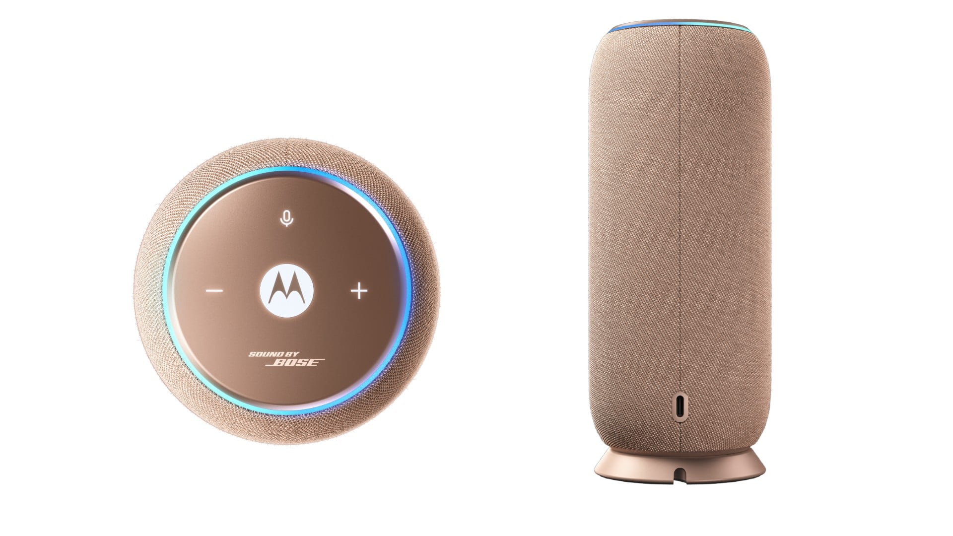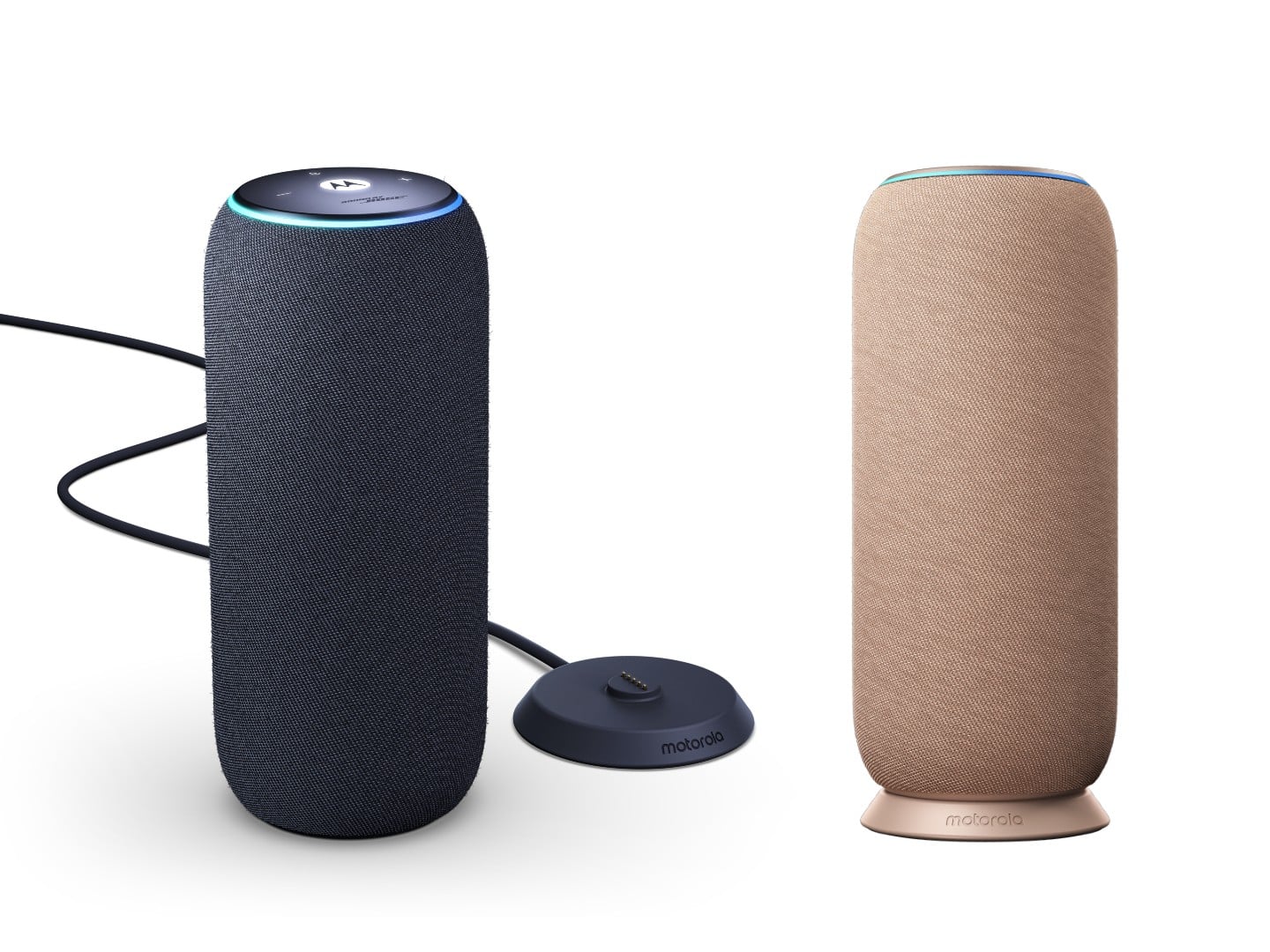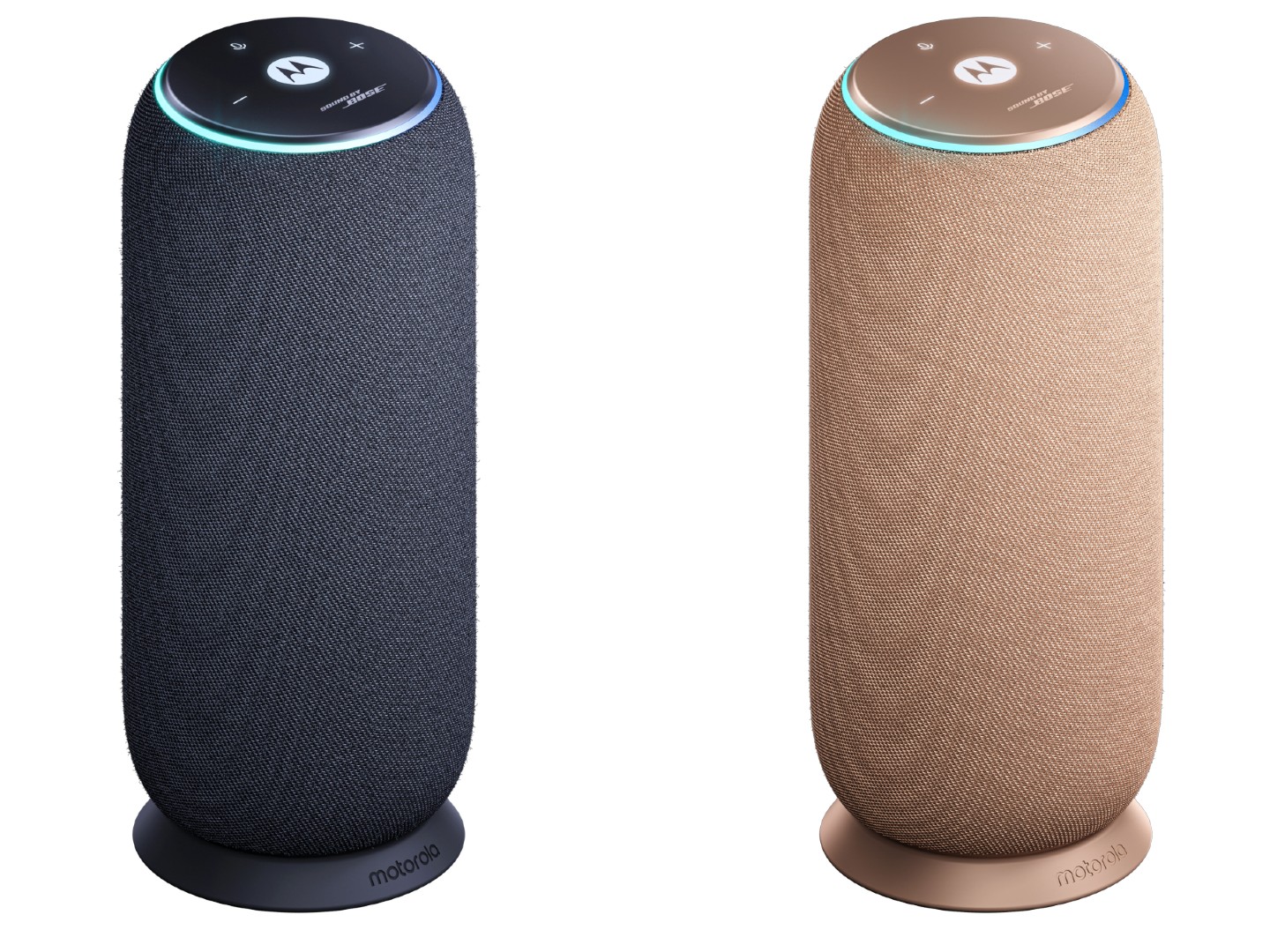 Le Moto Sound Flow se présente sous la forme d'un haut-parleur cylindrique avec un anneau LED sur le dessus et une base plate qui repose sur une station d'accueil. Motorola indique que l'enceinte est enveloppée d'un tissu raffiné à la texture serpentine et qu'elle est disponible en Pantone Carbon (noir) et Pantone Warm Taupe (marron).