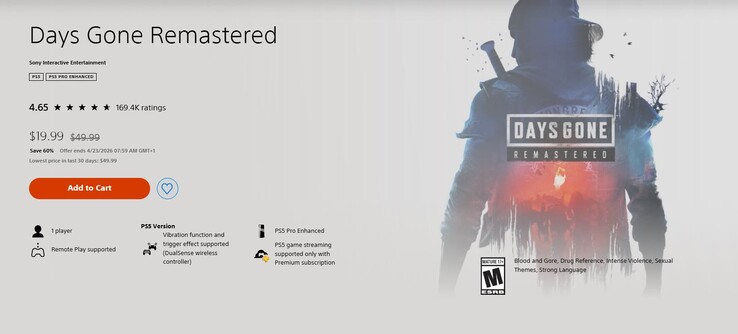 Days Gone Remastered a été lancé fin avril 2025 au prix de 49,99 $ sur PlayStation 5, les possesseurs de la version PlayStation 4 pouvant acheter la mise à jour pour seulement 10 $. Depuis, le jeu a bénéficié de plusieurs remises, mais la dernière en date réduit ce prix de 60 % jusqu'au 23 avril, le jeu étant désormais disponible sur le PlayStation Store au prix de 19,99 $, soit le prix le plus bas jamais atteint. Étant donné qu'il s'agit d'une exclusivité PlayStation relativement récente, il s'agit probablement du prix le plus bas pour un certain temps.