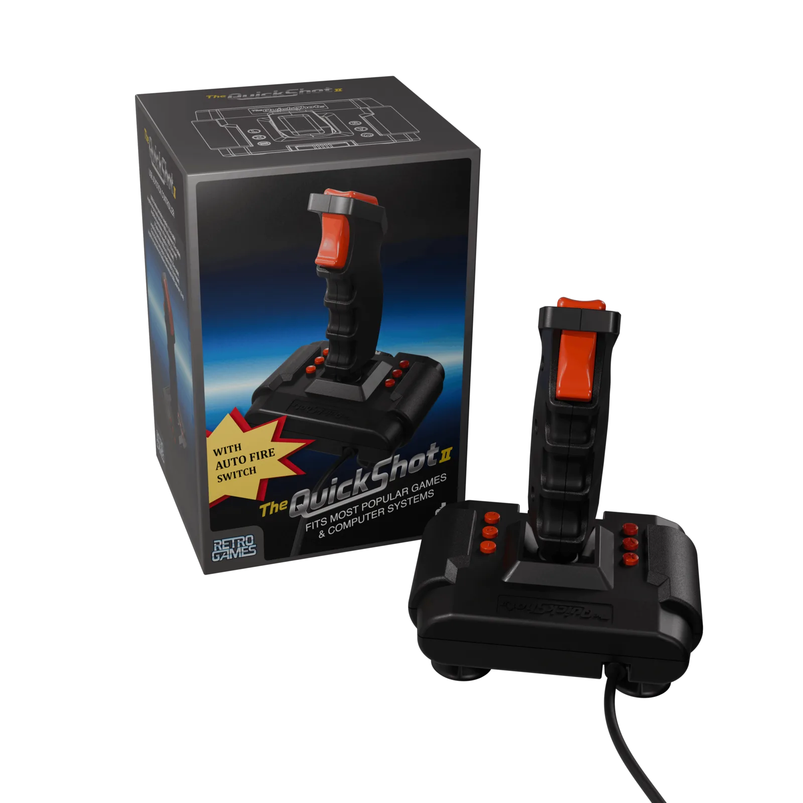 Pour rester en phase avec les contrôleurs modernes, le Quickshot II a été mis à jour avec une prise en charge USB pour plus de commodité et comprend un câble USB de 180 cm. Outre les PC et divers appareils rétro, la manette fonctionne également avec les répliques d'ordinateurs domestiques suivantes, fabriquées par Retro Games : TheC64, The Spectrum, TheA500 et le prochain TheA1200. Cela dit, il ne peut pas se connecter au C64 original et au Commodore Amiga via l'interface à 9 broches, et n'offre pas non plus de connectivité sans fil. Parmi les autres caractéristiques notables, citons des micro-interrupteurs précis, une articulation à rotule, deux boutons d'action, six boutons de tir programmables, un bouton de tir automatique et des ventouses.