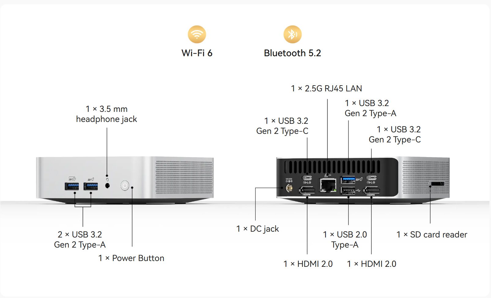Comme la dernière version, l'édition 2026 peut être équipée de 64 Go de RAM et de 3 To de stockage. La configuration des ports ne change pas non plus. Plus précisément, la nouvelle version du mini PC dispose des ports suivants :