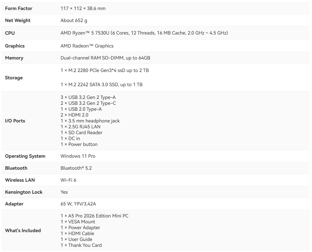 Geekom a présenté l'A5 Pro 2026 Edition comme un nouveau mini PC alimenté par AMD, mais il n'apporte pas de véritables améliorations par rapport à la dernière version lancée par la marque en janvier 2026. Pour revenir en arrière, le PC présenté précédemment est équipé du Ryzen 5 7430U, un processeur identique au Ryzen 5 5625U de la gamme Barcelo-U.