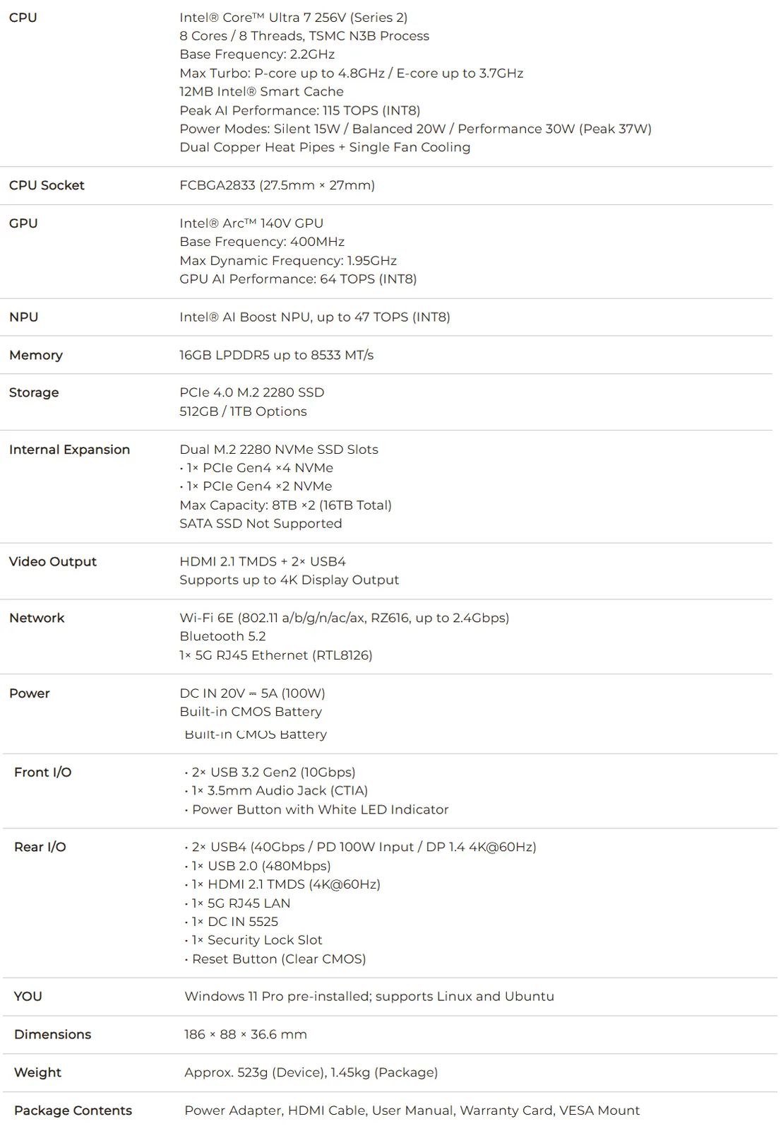 Sous le capot, ce petit mini PC embarque un Intel Core Ultra 7 256V, un processeur de milieu de gamme supérieur de la gamme Lunar Lake. Il est équipé l'iGPU Arc 140V qui peut gérer en douceur un bon nombre de jeux modernes à une résolution de 1080p avec des ajustements sur les paramètres visuels.