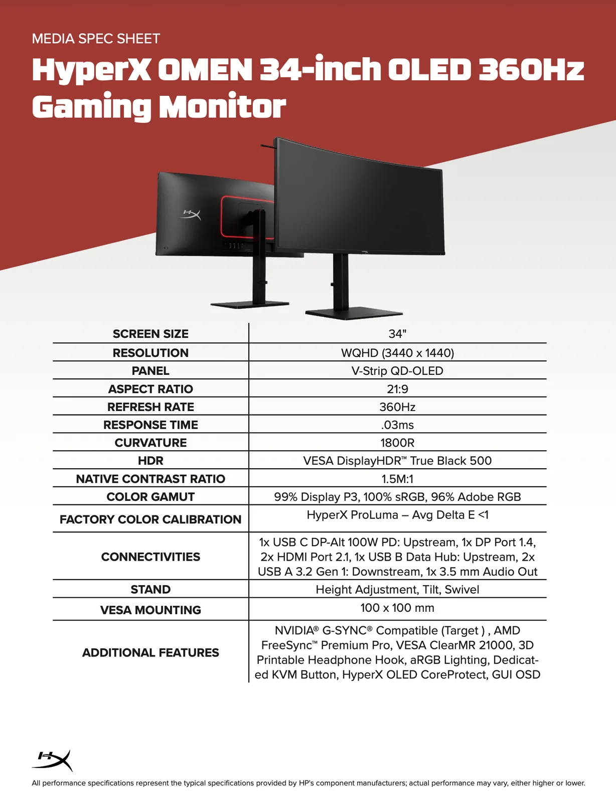 Cependant, l'HyperX Omen 34 pouces surpasse les anciens équivalents avec un taux de rafraîchissement de 360 Hz. Comme le souligne la fiche technique ci-dessous, le nouveau moniteur combine sa résolution 1440p et son taux de rafraîchissement de 360 Hz avec des temps de réponse GtG de 0,03 ms, ainsi que les technologies AMD FreeSync Premium Pro et Nvidia G-Sync pour atténuer le déchirement de l'image. Selon HP, le panneau est également certifié VESA DisplayHDR True Black 500. Par conséquent, l'HyperX Omen 34 pouces devrait atteindre 500 nits et au moins 95 % de couverture de l'espace colorimétrique DCI-P3, HP citant 99 % et 96 % de l'espace colorimétrique AdobeRGB.