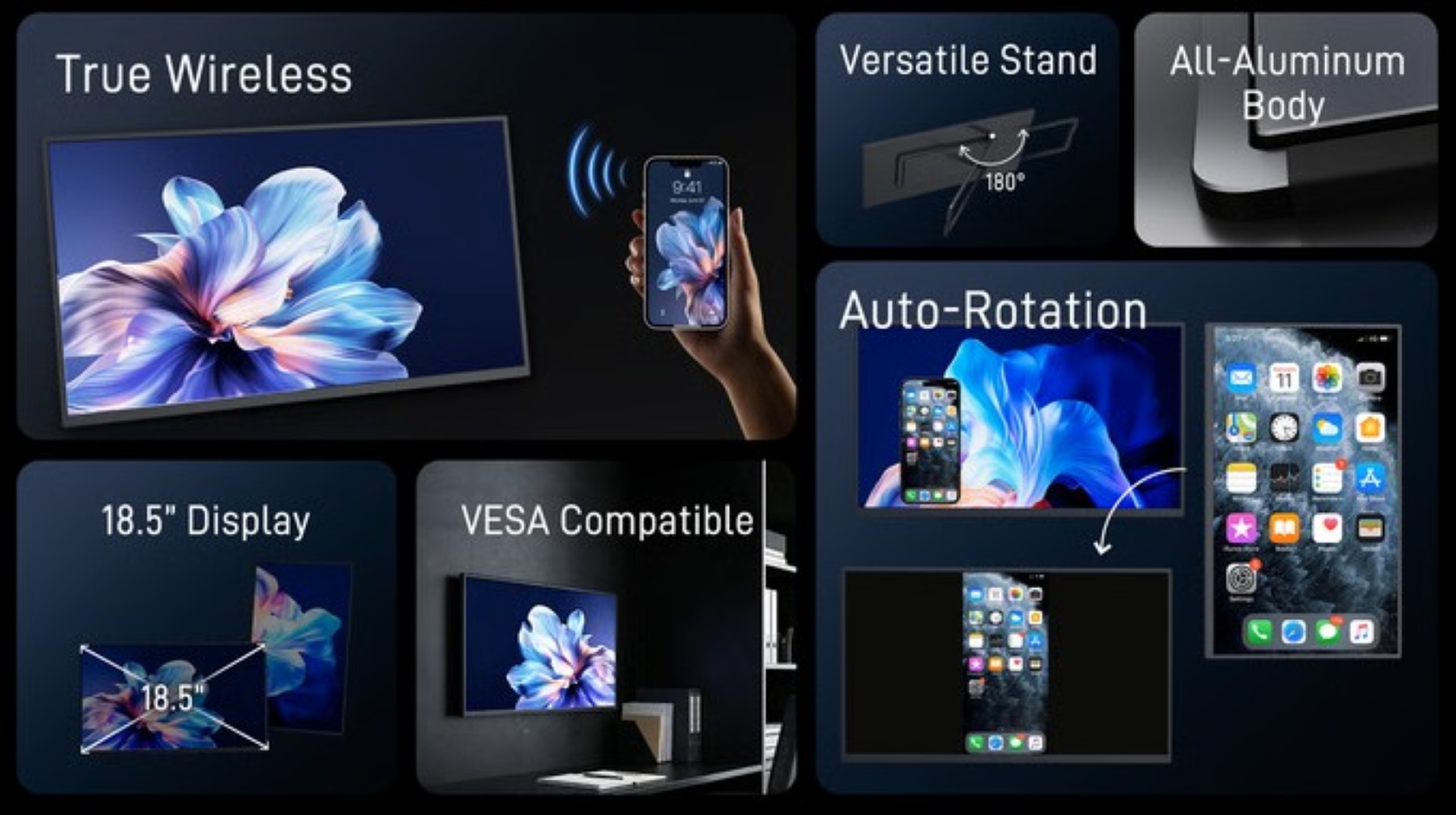 L'entreprise met en avant les nombreuses possibilités d'installation du moniteur, notamment via un support VESA 75x75 mm ou la béquille intégrée. Il prend également en charge l'orientation portrait et paysage. Bien que le Vuelim puisse fonctionner comme un moniteur filaire classique grâce à son interface DisplayPort USB-C et HDMI, sa principale caractéristique reste sa capacité sans fil via un module Wi-Fi 5GHz, ce qui lui permet de se connecter sans fil aux appareils Windows, macOS, Android et iOS.