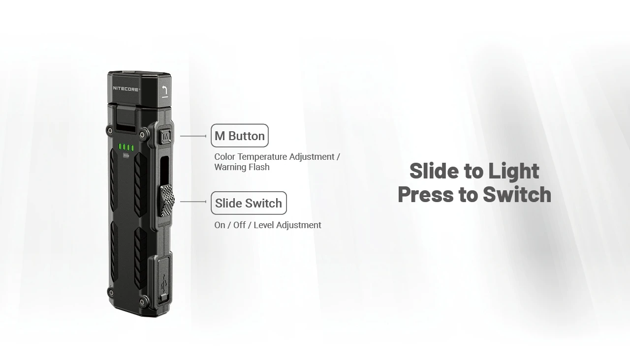 L'EDC est équipée de la fonction MCT (Multicolor Turntable), qui vous permet de changer la couleur de la lumière en mélangeant deux types de LED. Cette fonction est similaire à celle de la Tini 3 (revue, en allemand seulement). Vous pouvez choisir entre 3 000, 4 500 et 6 500 kelvins. Nitecore fournit également les valeurs CRI (Color Rendering Index). La lumière chaude à 3 000 kelvins est particulièrement bonne avec un IRC de 97. La lumière blanche neutre et la lumière blanche froide ont des IRC de 83 et 73, respectivement. Pour passer d'un mode à l'autre, il suffit d'appuyer sur un bouton dédié situé sur le côté. Si vous maintenez l'interrupteur enfoncé, un signal lumineux de 5 hertz s'allume. La lumière elle-même est activée en trois étapes à l'aide d'un interrupteur à glissière, comme sur l'EDC17 sur l'EDC17.