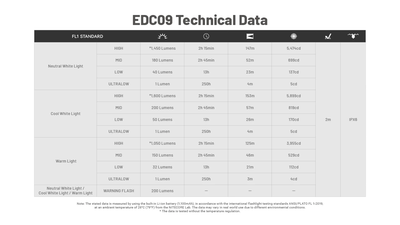 La lampe de poche est conforme à la norme IPX6, mesure un peu plus de 10 cm de long et pèse 114 grammes, batterie comprise. La batterie n'est pas remplaçable et se charge via USB-C, ce qui permet d'utiliser la lampe de poche tout en la chargeant. L'autonomie de la batterie est de 2 heures et 15 minutes en mode le plus lumineux et de 250 heures en mode le plus faible, quelle que soit la couleur de la lumière. Cependant, la portée et la luminosité sont affectées par la couleur de la lumière. Vous trouverez les données dans le tableau du fabricant ci-dessous.
