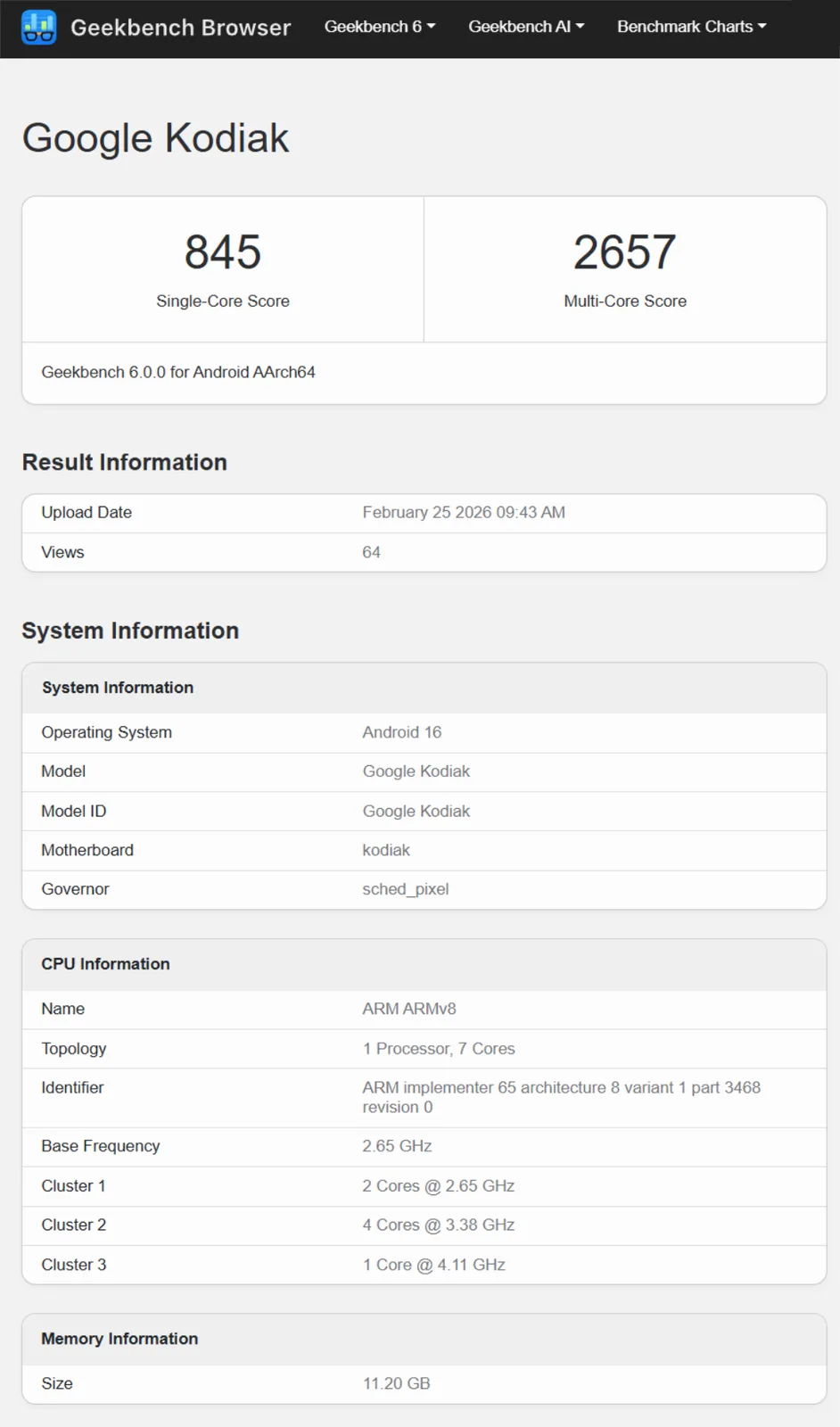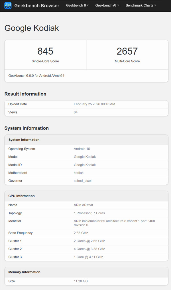 Aujourd'hui, un listing Geekbench qui a fuité suggère que Google prépare un départ inhabituel pour la prochaine série Pixel 11. Comme toujours, la plateforme de benchmarking ne fournit pas de nom de détail. Néanmoins, le nom "Google Kodiak" a déjà été établi comme nom de code pour le Pixel 10 Pro XL.
