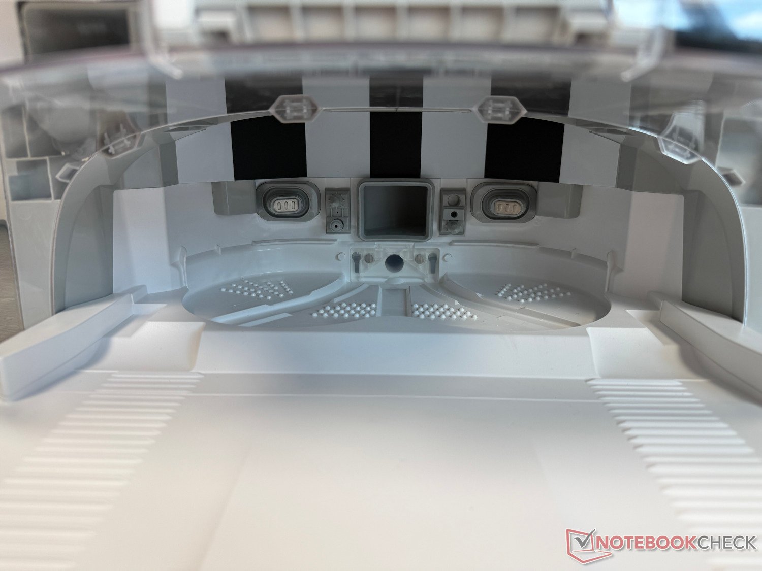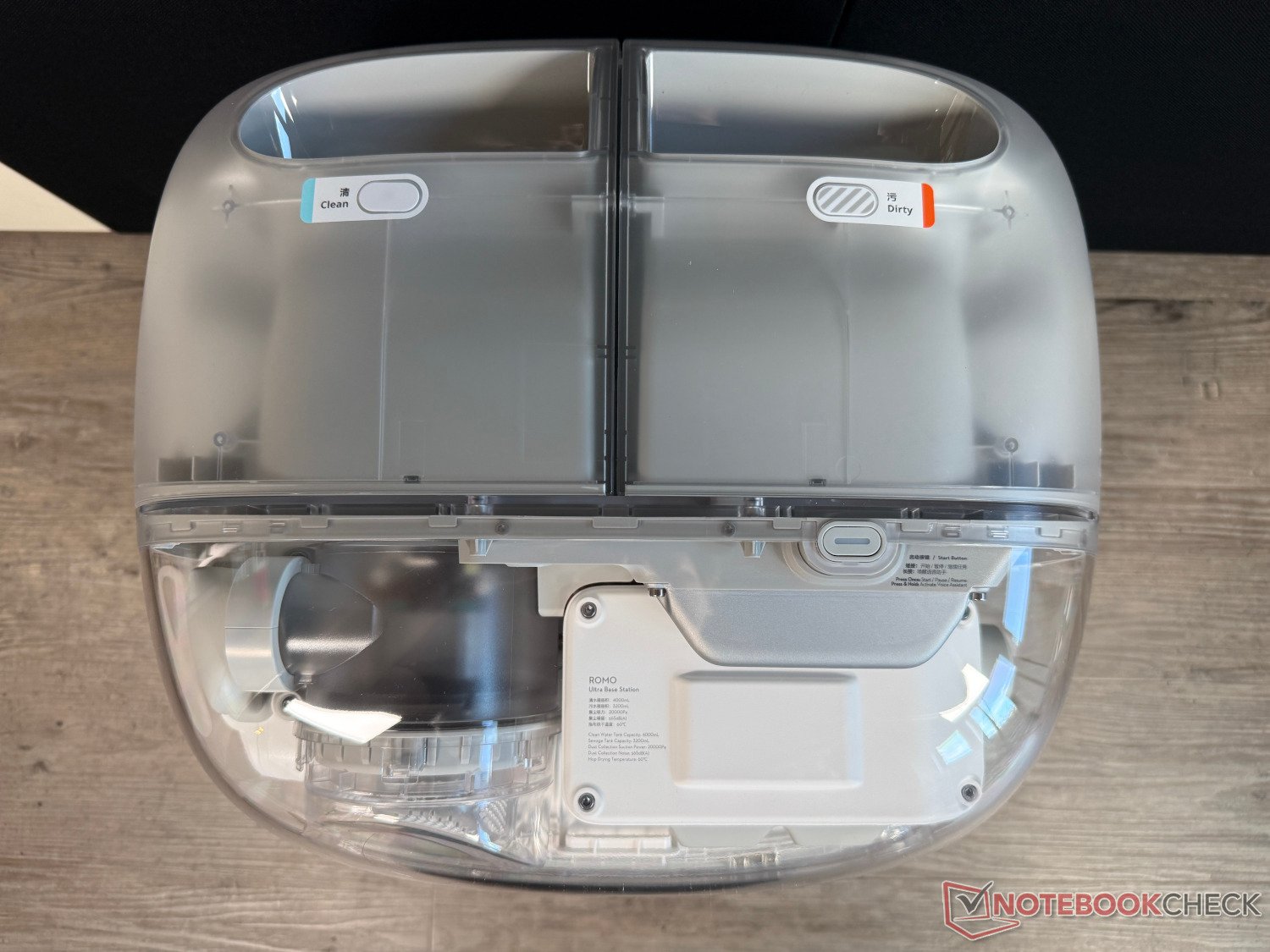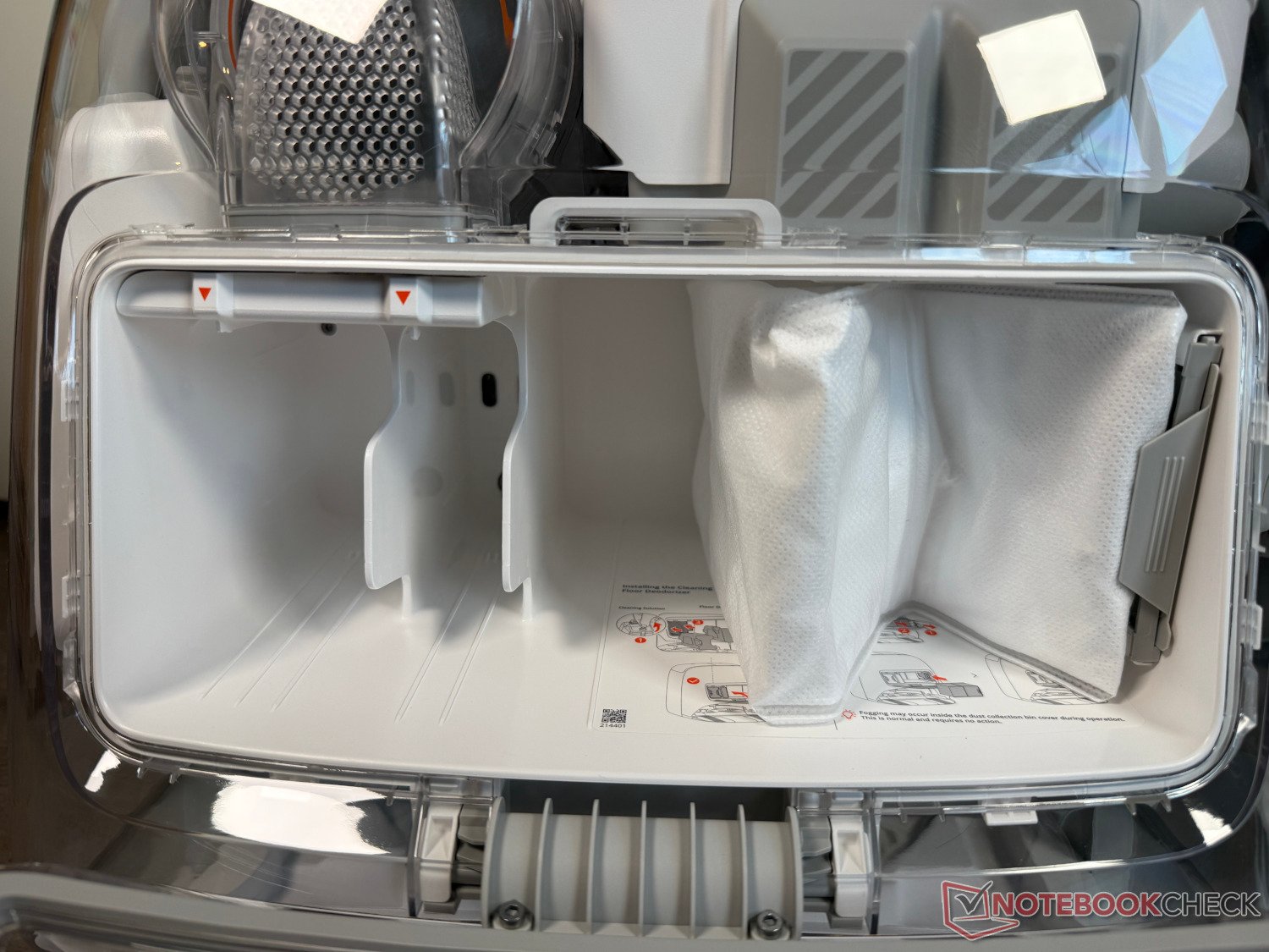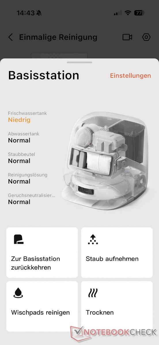La station de base autonettoyante est également incluse. Selon le fabricant, elle promet jusqu'à 200 jours de fonctionnement sans entretien. Toutefois, cela ne s'applique qu'à l'aspiration de la poussière dans le sac à poussière de 2,4 litres. Le réservoir d'eau fraîche de 4 litres et le réservoir d'eaux usées de 3,2 litres nécessitent une attention plus régulière. Après avoir lavé les mops à l'eau chaude jusqu'à 60°C, puis les avoir séchés à l'air chaud, la planche à laver de la station se nettoie toute seule. Cela a bien fonctionné lors du test.