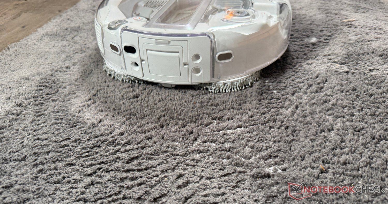 Il n'y a pas grand-chose à critiquer non plus en termes de performances de nettoyage. Même à la moyenne des trois puissances d'aspiration, il a éliminé la plupart des saletés testées (sable fin, miettes et poils de chien) d'un tapis à poils moyens grâce à ses rouleaux avec brosses et caoutchouc. Seuls quelques grains de sable sont restés sur place. Cependant, comme les serpillières ne peuvent être soulevées que dans une certaine mesure et ne peuvent pas être posées, les poils sont malheureusement devenus légèrement humides lors de l'utilisation combinée de la serpillière et de l'aspirateur.