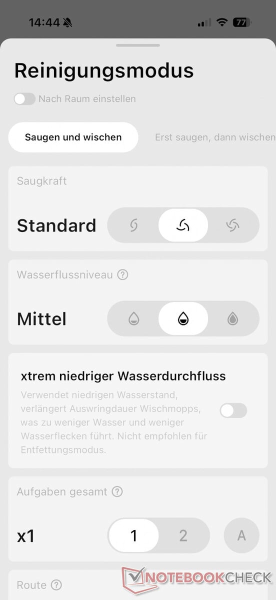 Les performances de nettoyage sont également bonnes pour un aspirateur robot doté de deux balais rotatifs, mais pas tout à fait au même niveau que les modèles à balais roulants tels que le Dreame Aqua10 Ultra Roller Complet. Cependant, nous devons noter que le sol était nettement plus humide à un niveau d'humidité moyen qu'avec d'autres aspirateurs robots dotés d'une fonction de nettoyage à un niveau comparable. Avec une mise à jour du micrologiciel pour le lancement mondial la semaine dernière, DJI a introduit une autre option avec un débit d'eau particulièrement faible, de sorte qu'il y a maintenant un total de quatre niveaux à choisir.