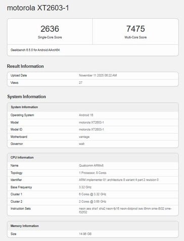 Le listing Geekbench montre que le téléphone porte le numéro de modèle "Motorola XT2603-1" et qu'il embarque 16 Go de mémoire vive. En termes de performances, le téléphone obtient un score de 2 636 pour un seul cœur et de 7 475 pour plusieurs cœurs. Ces chiffres représentent des performances de calcul légèrement supérieures à celles du plus puissant des processeurs Snapdragon 8 Gen 3 Snapdragon 8 Gen 3 les plus puissants de nos tests.