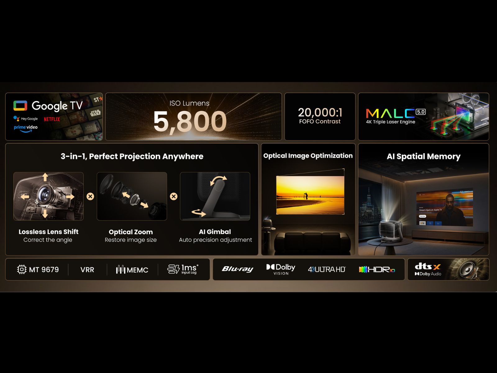 Parmi les autres fonctions intelligentes, citons l'ajustement automatique de l'écran, l'autofocus, l'évitement des obstacles, l'adaptation de la couleur du mur et les mécanismes de protection des yeux, tous gérés par des ajustements IA en temps réel. Le projecteur fonctionne sur un système basé sur Google et comprend 4 Go de RAM avec 64 Go de stockage interne.