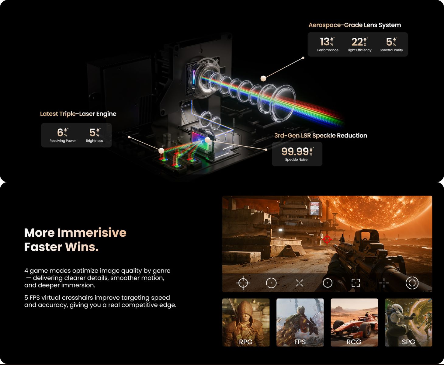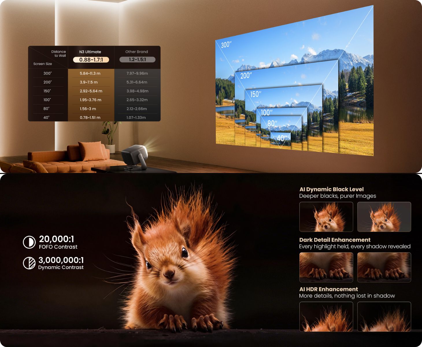 En termes de qualité d'image, le N3 Ultimate utilise une source lumineuse tri-laser et offre une résolution 4K avec une gamme de couleurs BT.2020 revendiquée à 110 % et un Delta E d'environ 0,7. Le projecteur affiche également un taux de contraste de 20 000:1 et prend en charge Dolby Vision et HDR10, ainsi que Dolby Audio et DTS-X pour la sortie sonore.